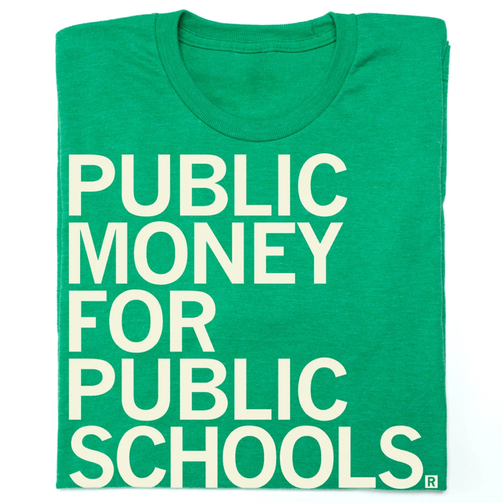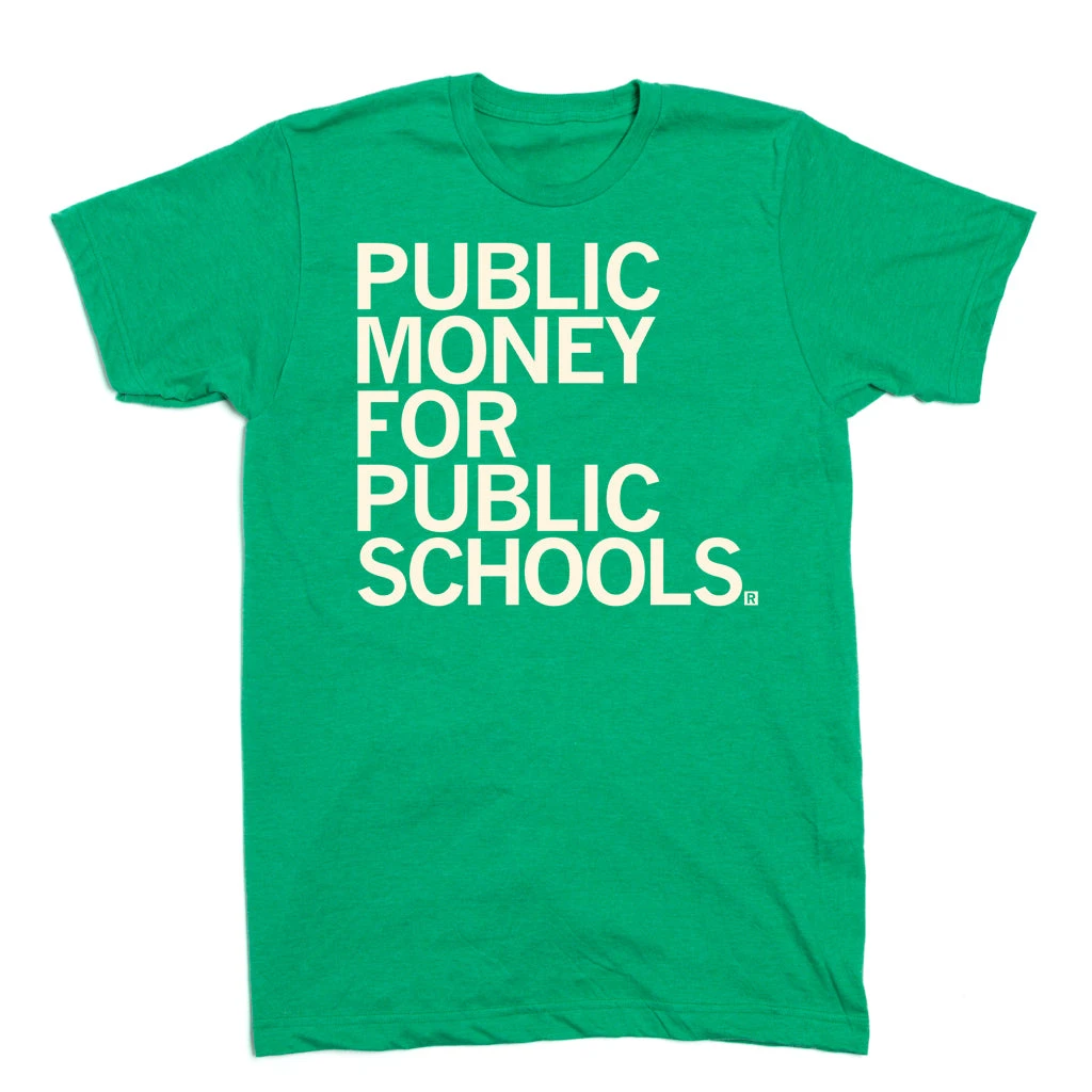 Public Money For Public Schools. A Portion of All RAYGUN Sales Raise Money For Organizations That We Support. White Screen Print on a Heather Kelly Green T-shirt (50% Combed Ringspun Cotton / 50% Polyester). Cut and sewn sweatshop free. Designed and printed by Union Labor at RAYGUN.