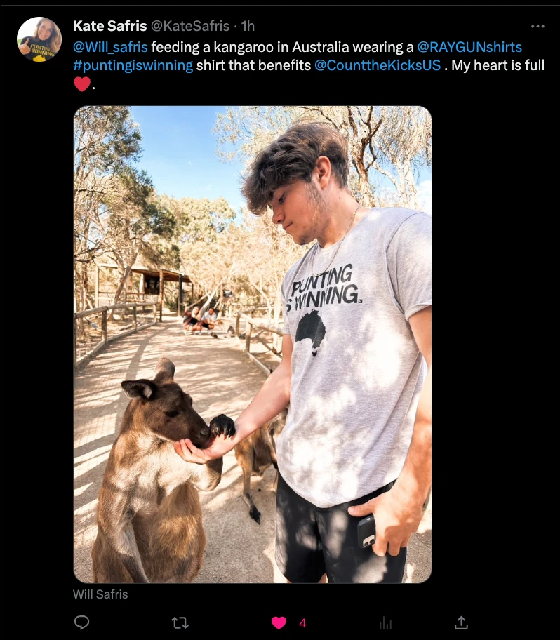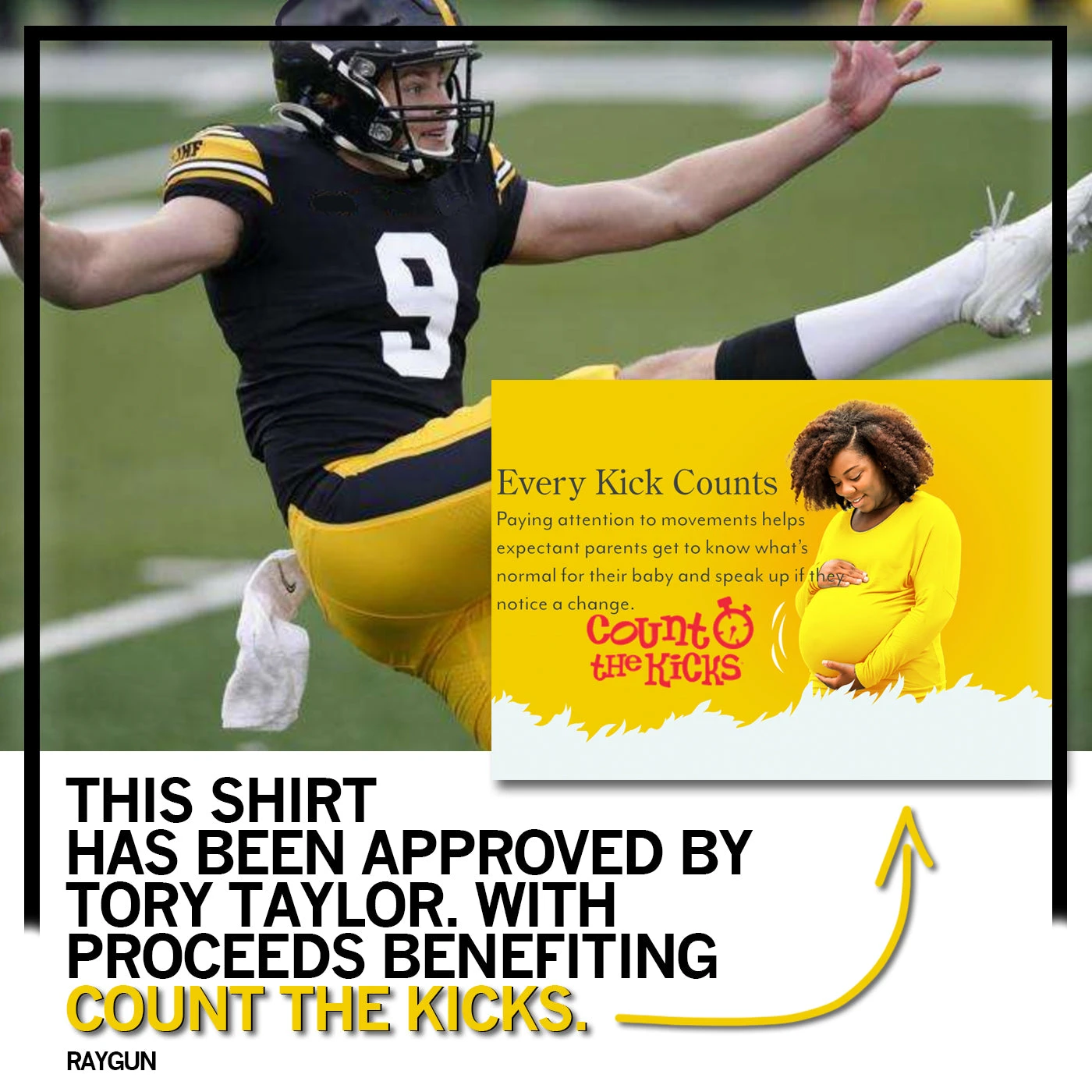 Tory Taylor: Punting is Winning. Officially licensed with Tory Taylor. This shirt has been approved by Tory Taylor, with proceeds benefiting Count The Kicks. Black Screen Print on a Light Grey T-shirt (90% Combed Ringspun Cotton / 10% Polyester). Cut and sewn sweatshop free. Designed and printed by Union Labor at RAYGUN.
