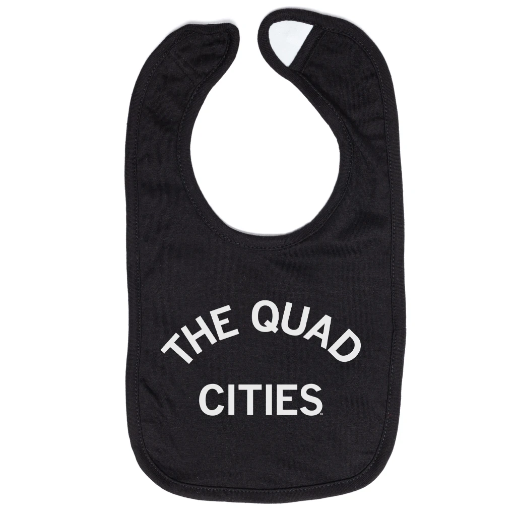 The Quad Cities of IA & IL. A Portion of All RAYGUN Sales Raise Money For Organizations That We Support. White Screen Print on a Black Bib (100% Cotton). Cut and sewn sweatshop free. Designed and printed by Union Labor at RAYGUN.