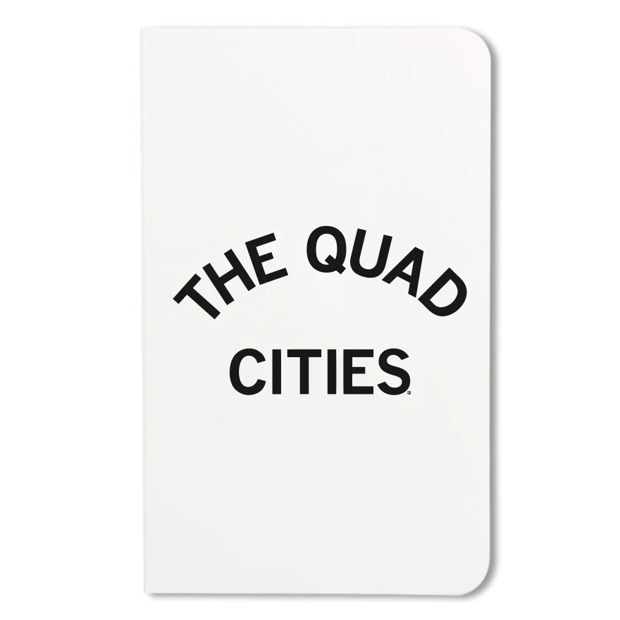 The Quad Cities. Black Screen Print on Unlined paper made in the USA, and dimensionsn is 5.5″ x 8.5″. Assembled using union labor at Garner Printing in Des Moines, IA.
