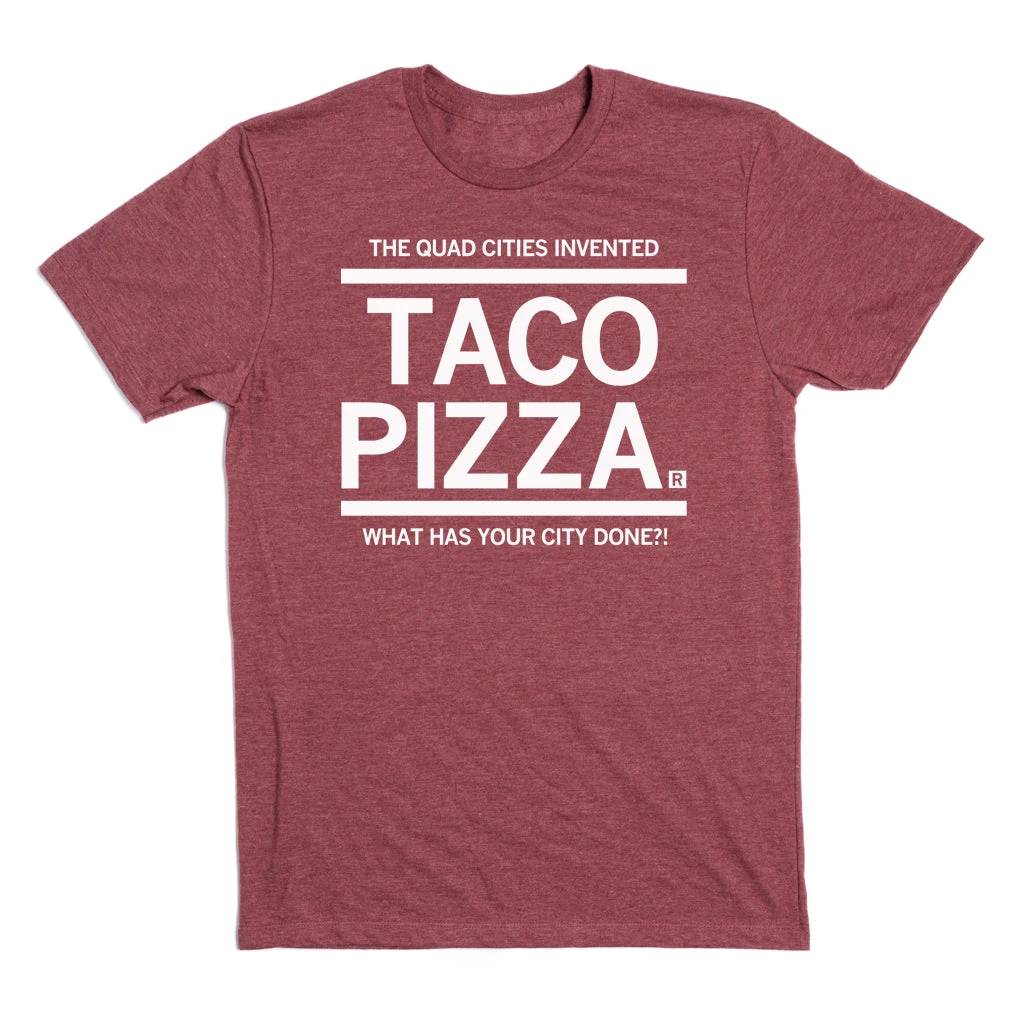 The Quad Cities Invented Taco Pizza. What Has Your City Done? A Portion of All RAYGUN Sales Raise Money For Organizations That We Support. White Screen Print on a Heather Burgundy T-shirt (50% Combed Ringspun Cotton / 50% Polyester). Cut and sewn sweatshop free. Designed and printed by Union Labor at RAYGUN.