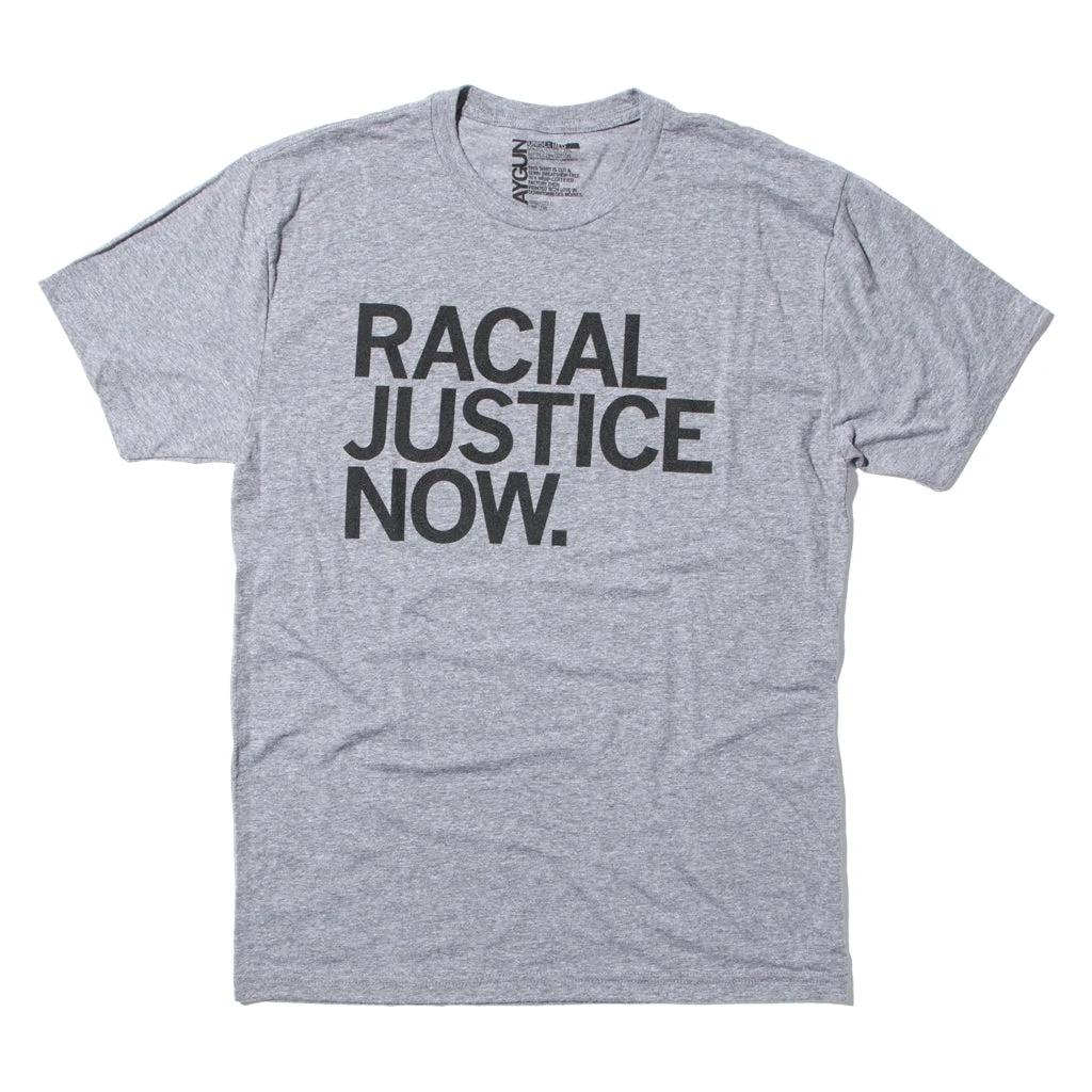 Racial Justice Now! 100% of profits benefit Des Moines Black Lives Matter. Black Screen Print on a Dark Grey Heather T-shirt (65% Polyester / 35% Combed Ringspun Cotton). Cut and sewn sweatshop free. Designed and printed by Union Labor at RAYGUN.