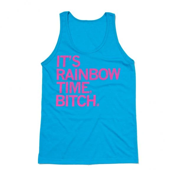 It’s Rainbow Time, Bitch. Pink Screen Print on a Neon Heather Blue Tank Top (50% Combed & Ringspun Cotton / 50% Polyester). Cut & sewn sweatshop free. Designed & printed by Union Labor at RAYGUN.