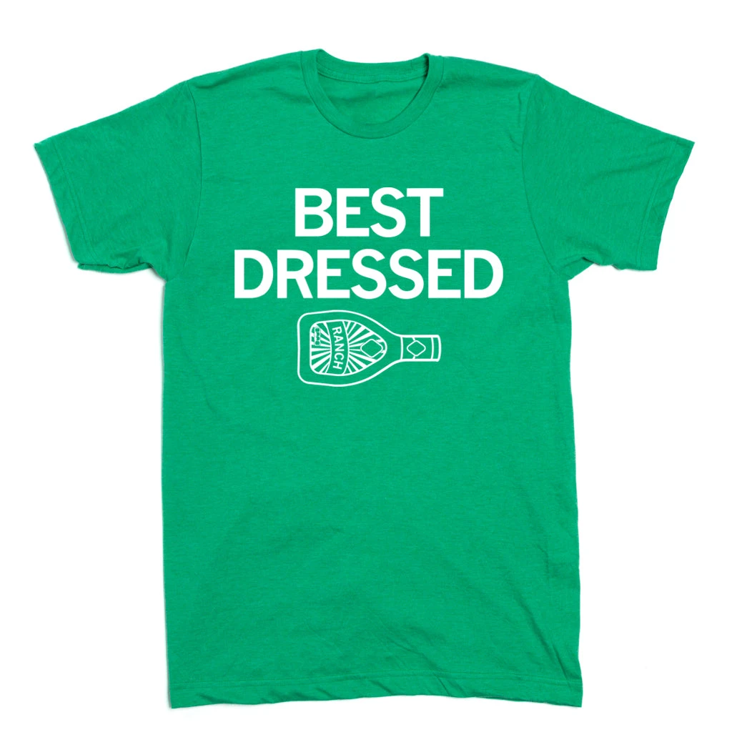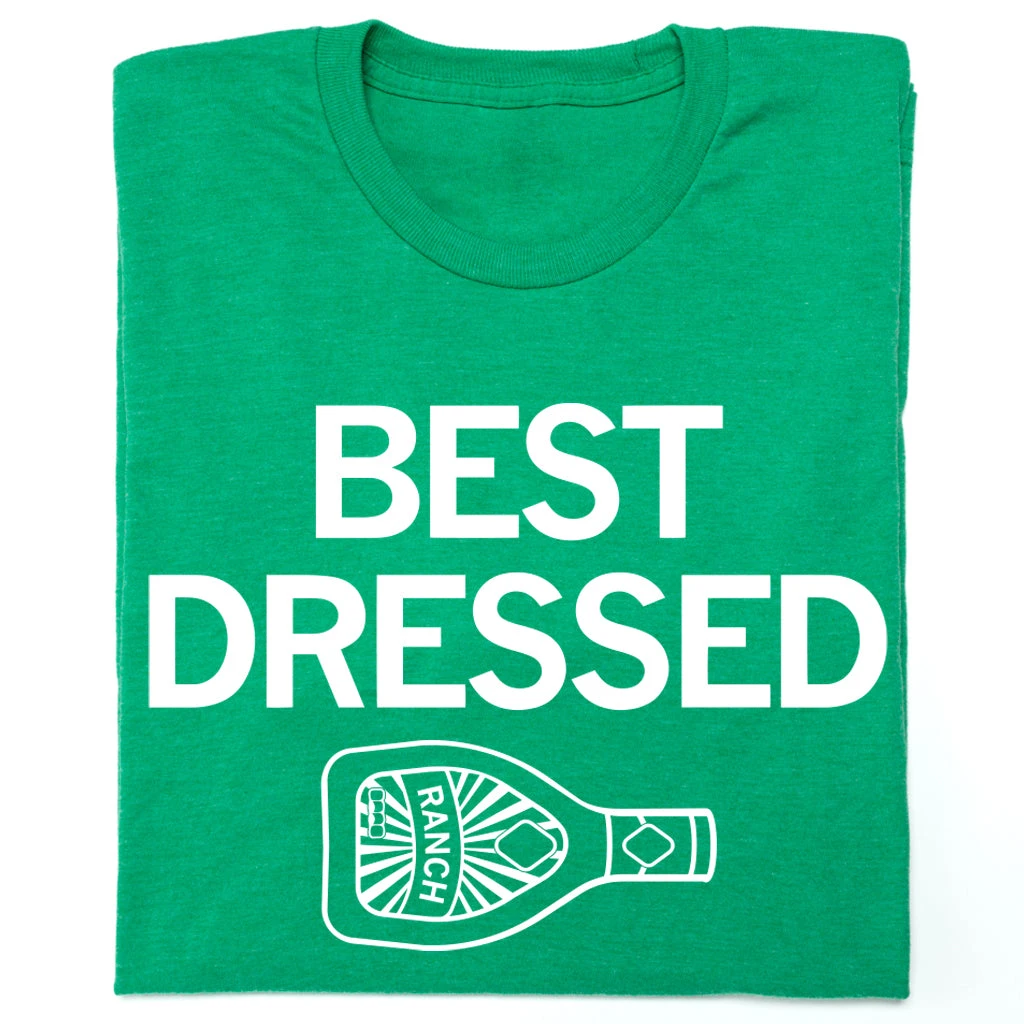 Ranch: Best Dressed. A Portion of All RAYGUN Sales Raise Money For Organizations That We Support. White Screen Print on a Heather Kelly Green T-shirt (50% Combed Ringspun Cotton / 50% Polyester). Cut and sewn sweatshop free. Designed and printed by Union Labor at RAYGUN.
