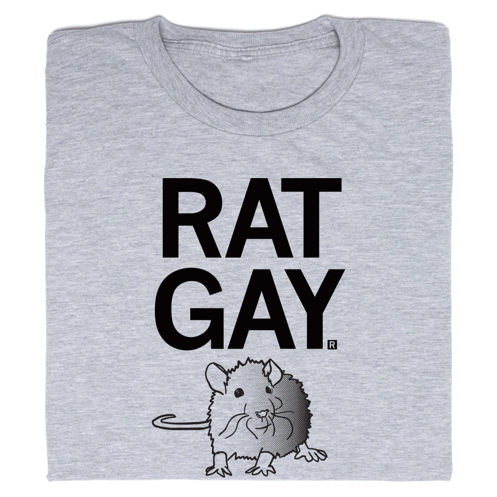 Rat Gay. A Portion of All RAYGUN Sales Raise Money For Organizations That We Support. Black Screen Print on a Light Grey T-shirt (90% Combed Ringspun Cotton / 10% Polyester). Cut and sewn sweatshop free. Designed and printed by Union Labor at RAYGUN.
