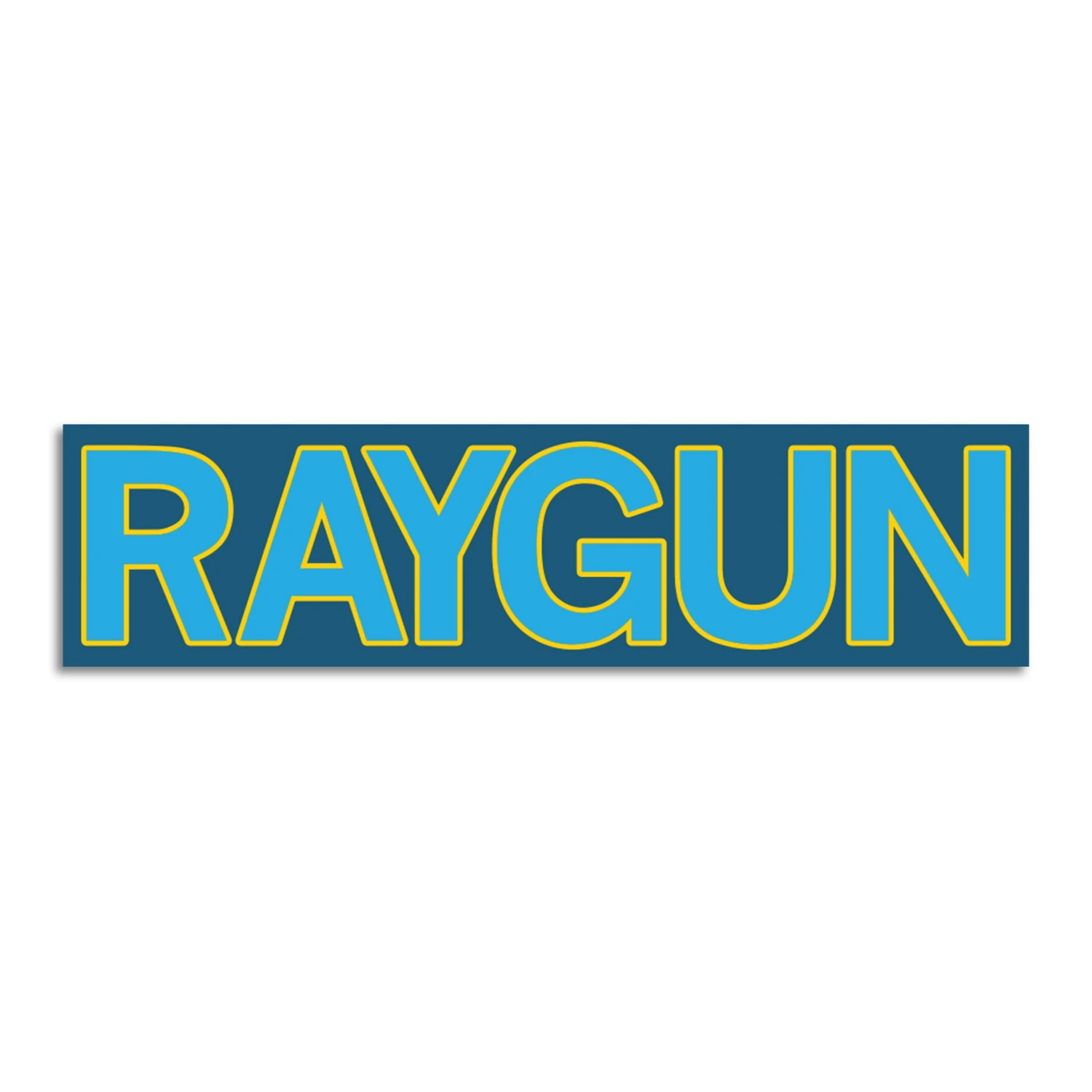 RAYGUN Block Text Logo Blue & Yellow Die-Cut Sticker. 5″ x 1.25″ Vinyl sticker. Designed by RAYGUN and printed by Sinclair Graphics in Des Moines, IA.