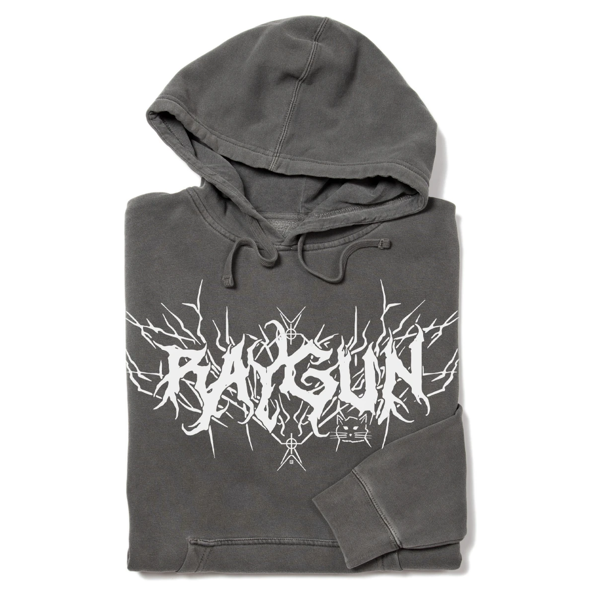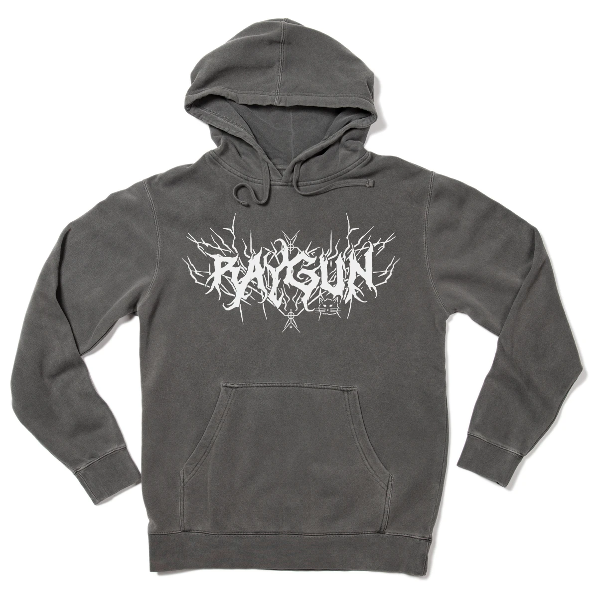 RAYGUN. A Portion of All RAYGUN Sales Raise Money For Organizations That We Support. White Screen Print on a Pigment Black Pullover Hoodie (80% Combed Ringspun Cotton / 20% Polyester). Cut and sewn sweatshop free. Designed and printed by Union Labor at RAYGUN.