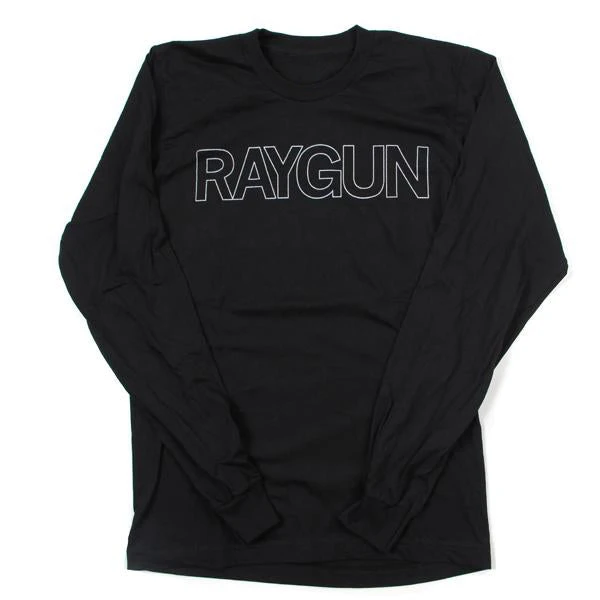 RAYGUN Text Logo. A Portion of All RAYGUN Sales Raise Money For Organizations That We Support. White Screen Print Black Long Sleeve T-shirt (100% Combed and Ringspun Cotton).Cut and sewn sweatshop free. Designed and printed by Union Labor at RAYGUN.