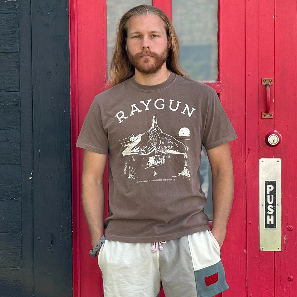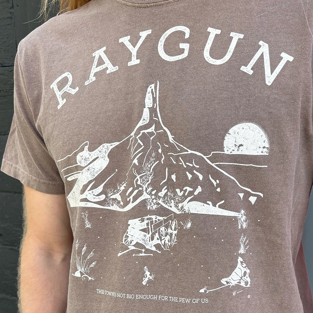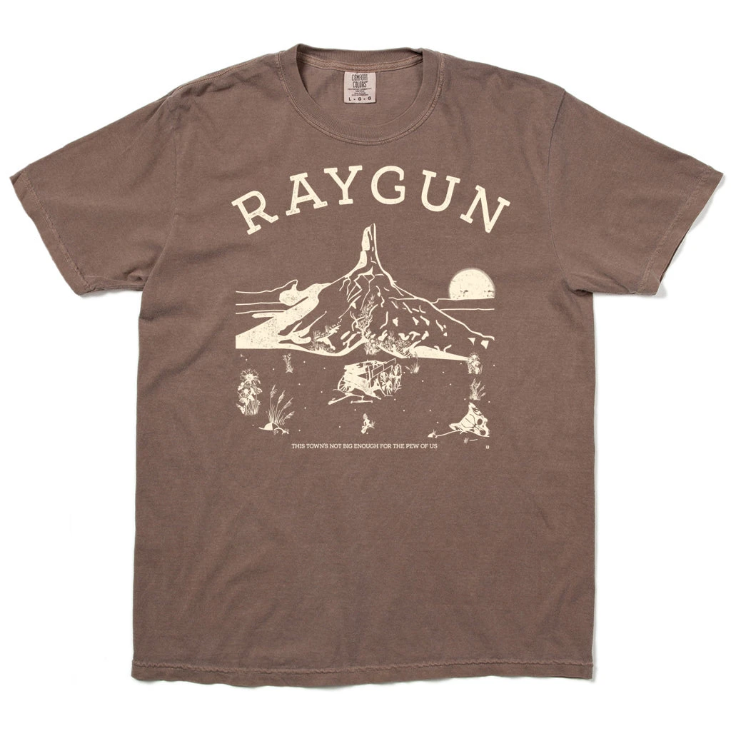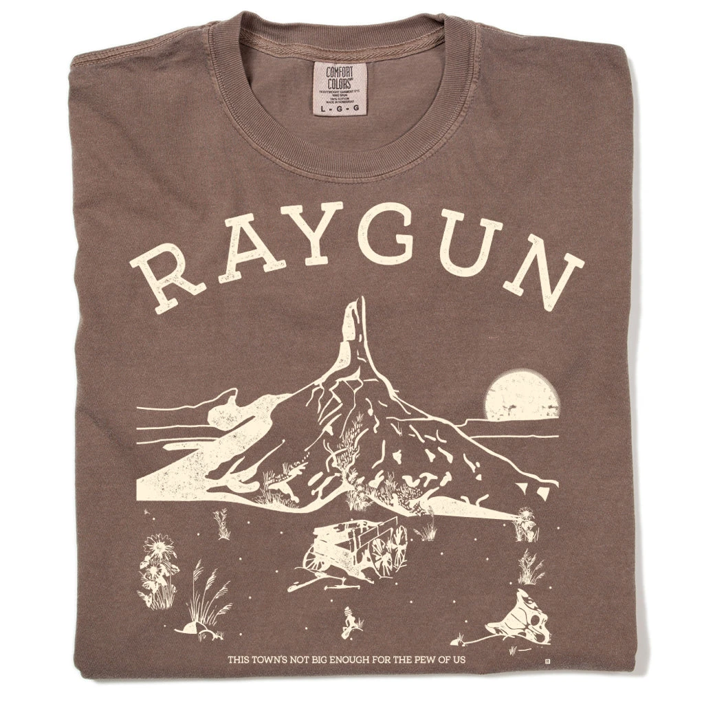 Western RAYGUN. A Portion of All RAYGUN Sales Raise Money For Organizations That We Support. White Screen Print on a Garment-Dyed Heavyweight Espresso T-shirt (100% Combed Ringspun Cotton Heavyweight). Cut & sewn sweatshop free. Designed and Printed by Union Labor at RAYGUN.