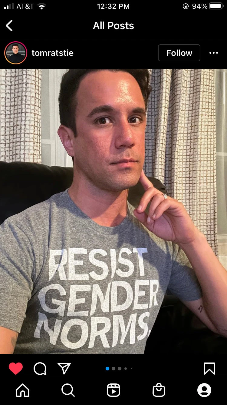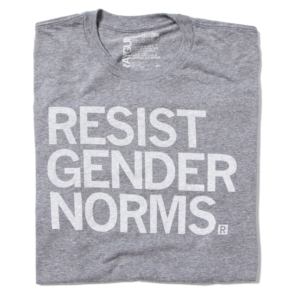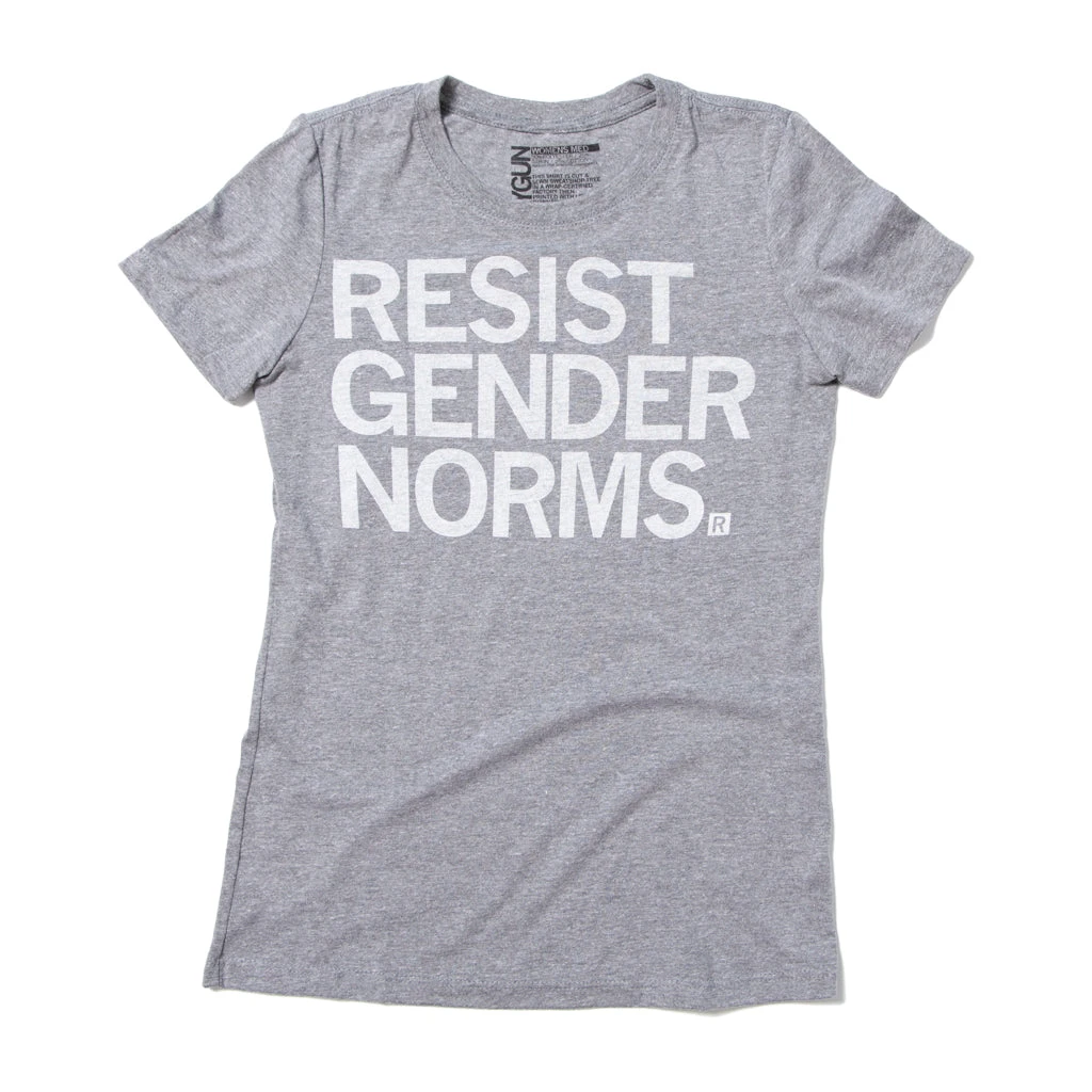 Resist Gender Norms. A Portion of All Raygun Sales Raise Money For Organizations That We Support. White Screen Print on a Heather Grey T-shirt (65% Polyester / 35% Combed Ringspun Cotton). Cut and sewn sweatshop free. Designed and printed by Union Labor at RAYGUN.