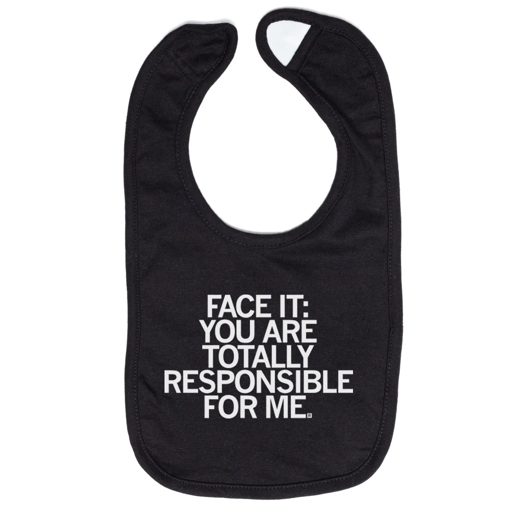 Face It: You’re totally responsible for me. A Portion of All RAYGUN Sales Raise Money For Organizations That We Support. White Screen Print on a Black Bib (100% Baby Rib Cotton). Cut and sewn sweatshop free. Designed and printed by Union Labor at RAYGUN.