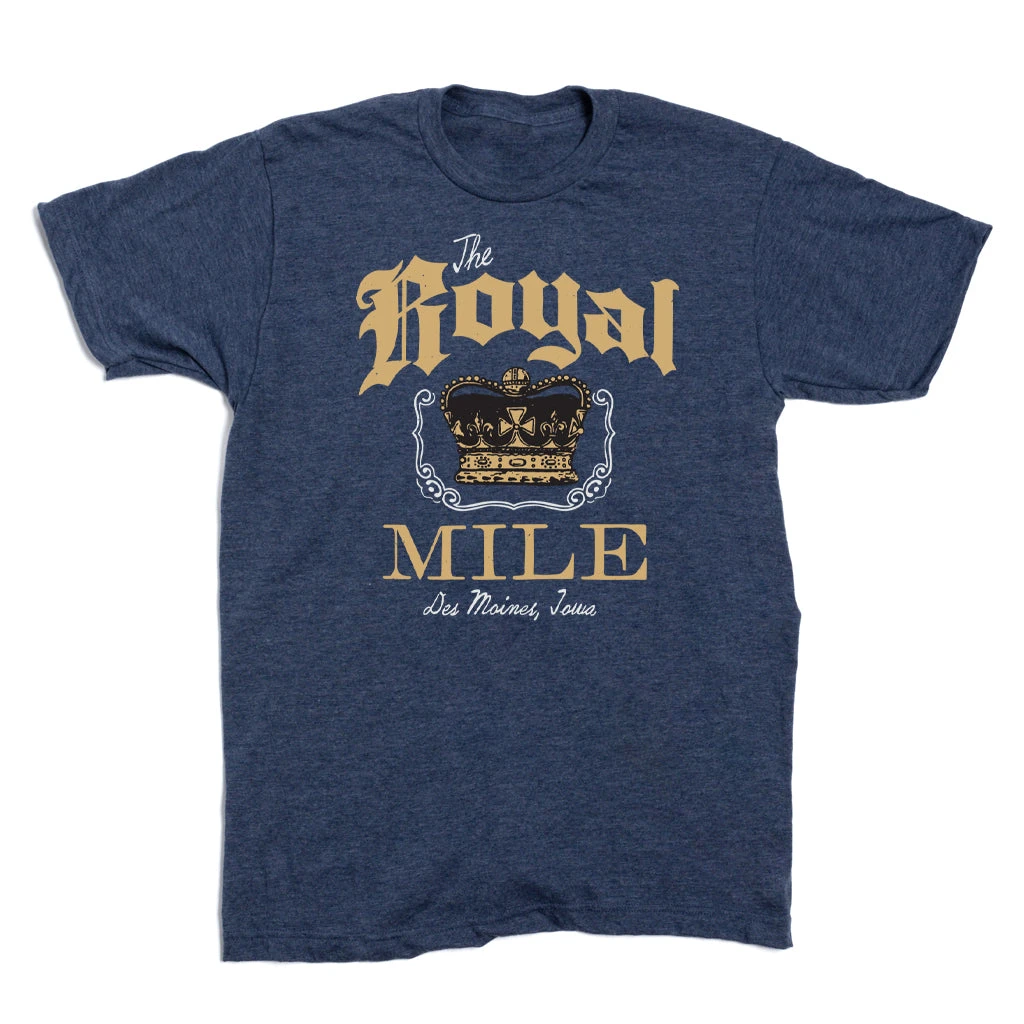 The Royal Mile. Des Moines, Iowa. Gold and White Screen Print on a Heather Navy T-shirt (60% Combed Ringspun Cotton / 40% Polyester). Cut & sewn sweatshop free. Printed by Union Labor at RAYGUN.