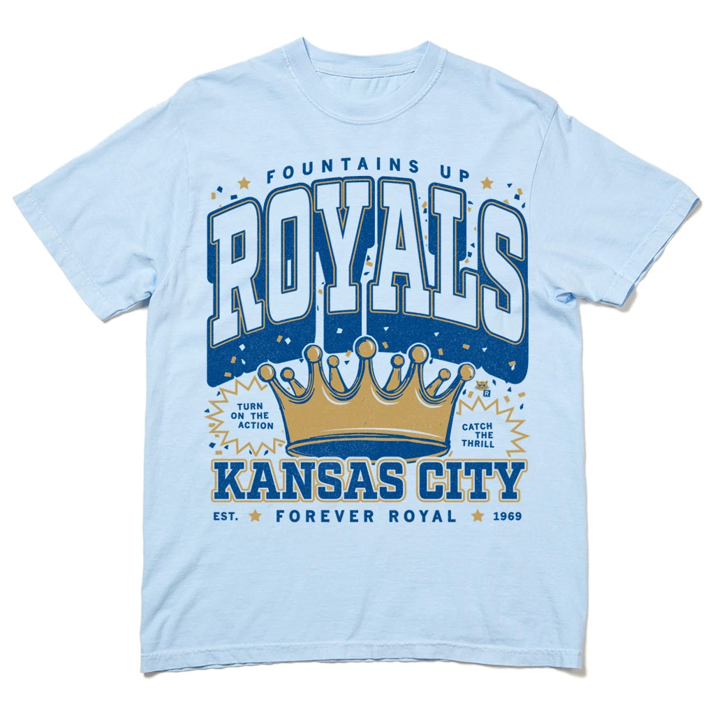 Turn on the action. Catch the thrill. Kansas City: forever royal. A Portion of All RAYGUN Sales Raise Money For Organizations That We Support. Royal & Gold Screen Print on a Garment-Dyed Heavyweight Hydrangea T-shirt (100% Combed Ringspun Cotton Heavyweight). Cut & sewn sweatshop free. Designed and Printed by Union Labor at RAYGUN.