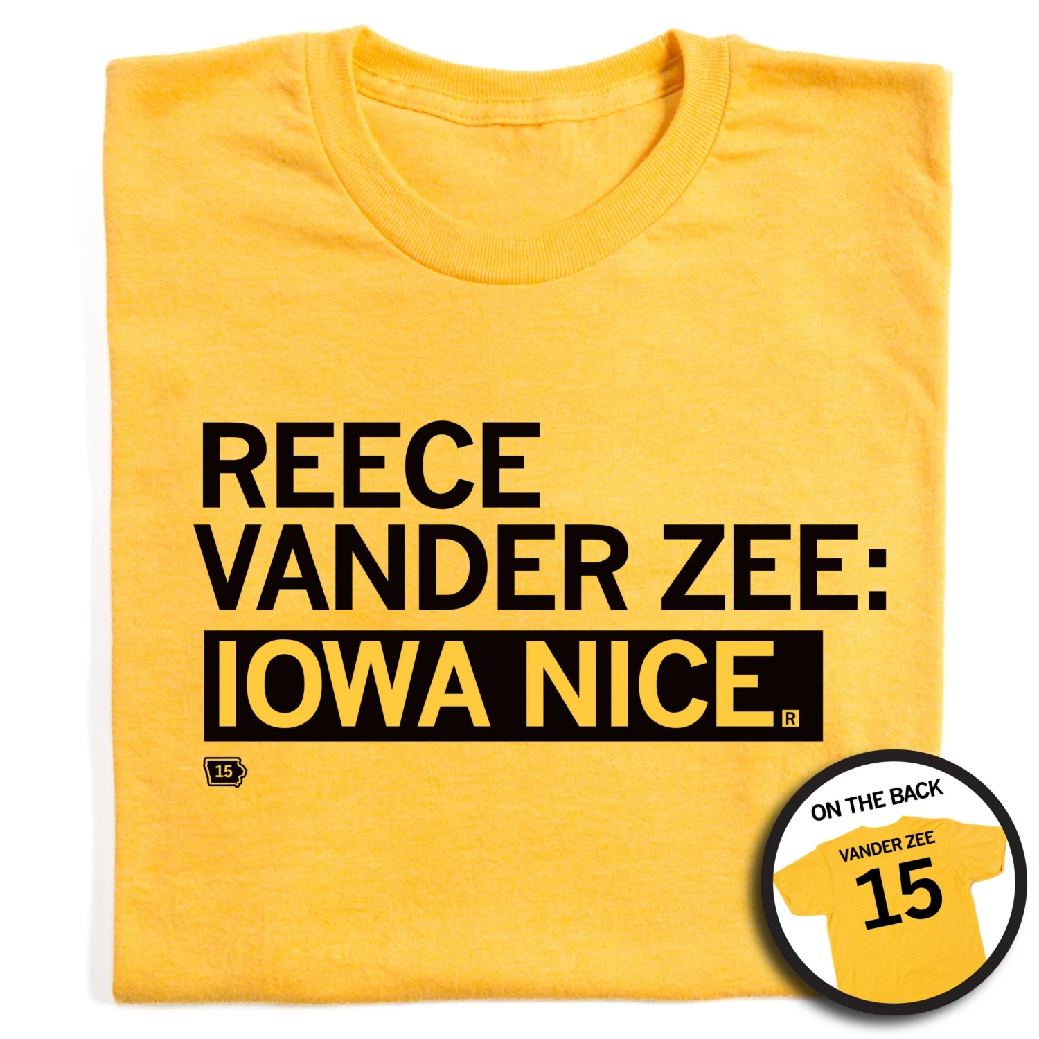 Reece Vander Zee: Iowa Nice. Officially licensed with Reece Vander Zee. Black Screen Print on a Heather Mellow Yellow T-shirt (50% Combed Ringspun Cotton 50% Polyester). Cut and sewn sweatshop free. Designed and printed by Union Labor at RAYGUN.