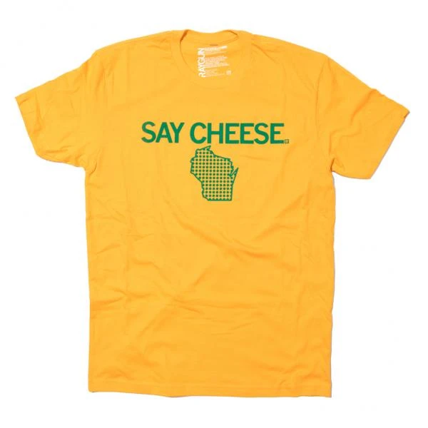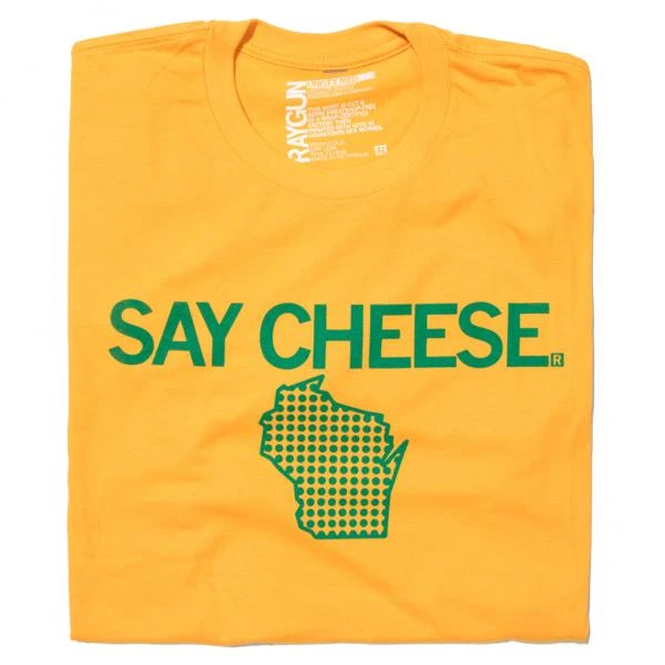Wisconsin: Say Cheese. This Design Has Been Retired and is No Longer Available on Our Sales Floors But Can Be Ordered Here Online! Since All of Our Retired Designs Are Printed on Demand, Please Allow For a Couple Extra Days Before Shipping. A Portion of All Raygun Sales Raise Money For Organizations That We Support. Green Screen Print on a Gold T-shirt (100% Combed Ringspun Cotton) Cut & sewn sweatshop-free. Designed & screen printed by union labor at RAYGUN.