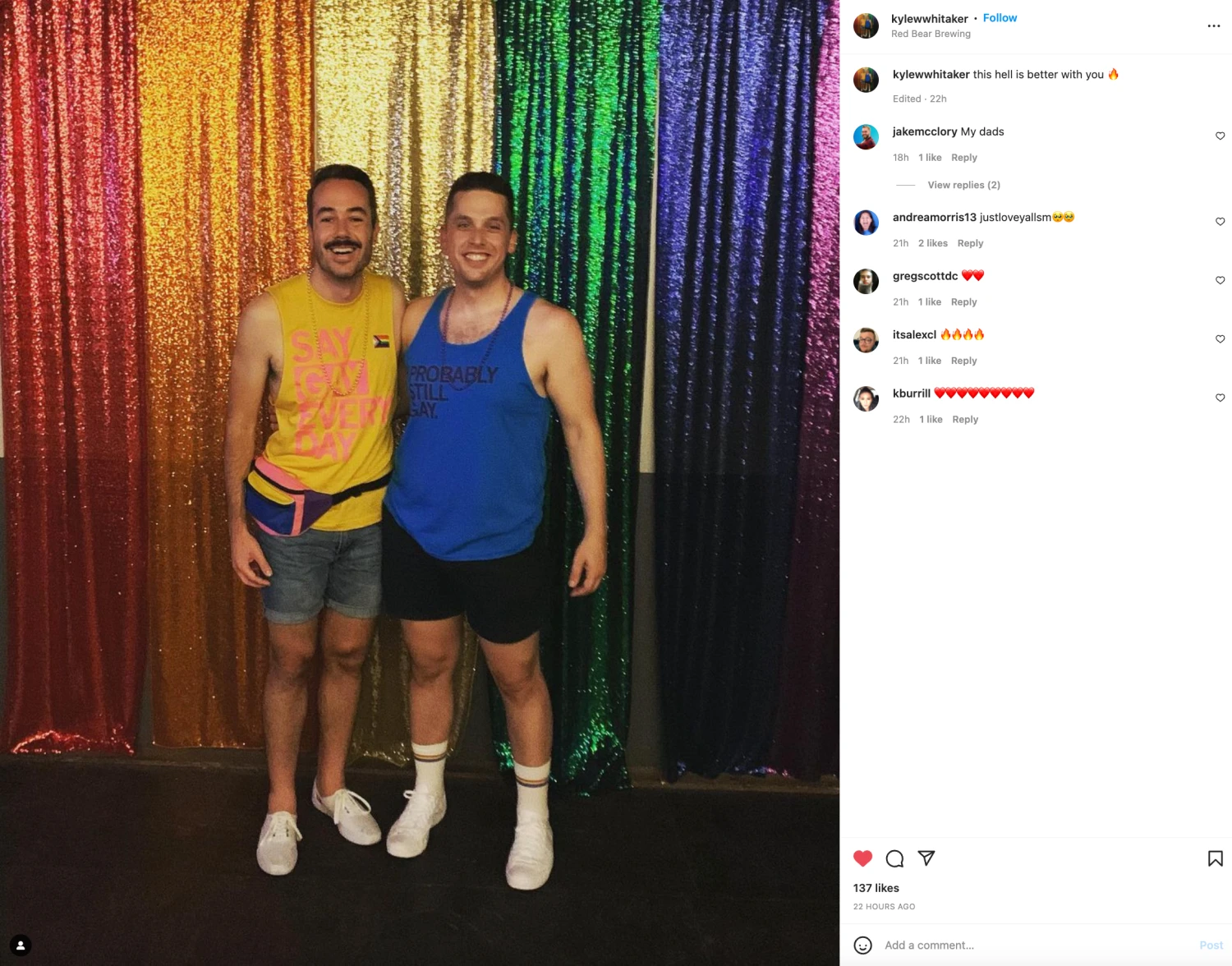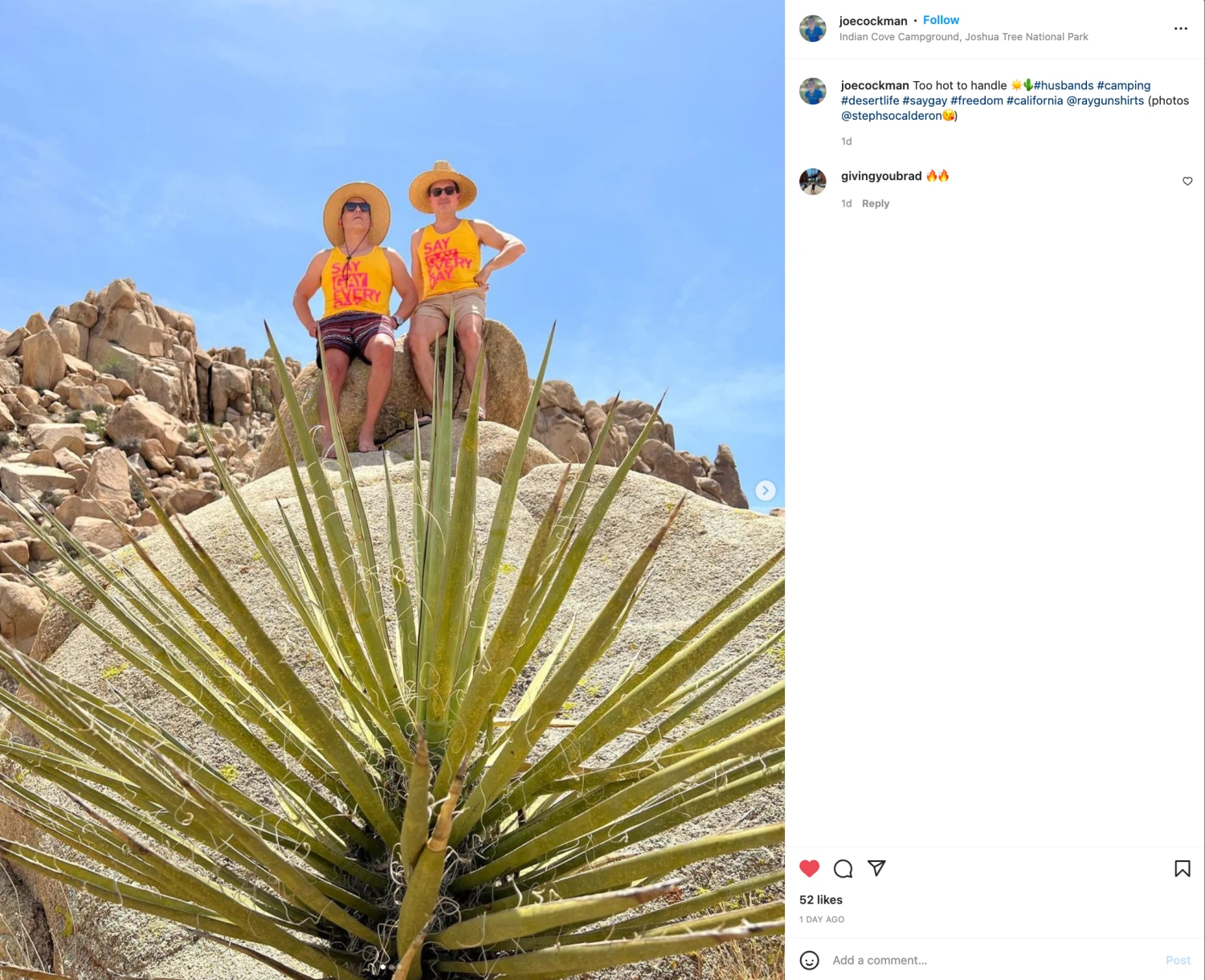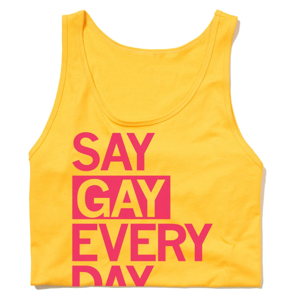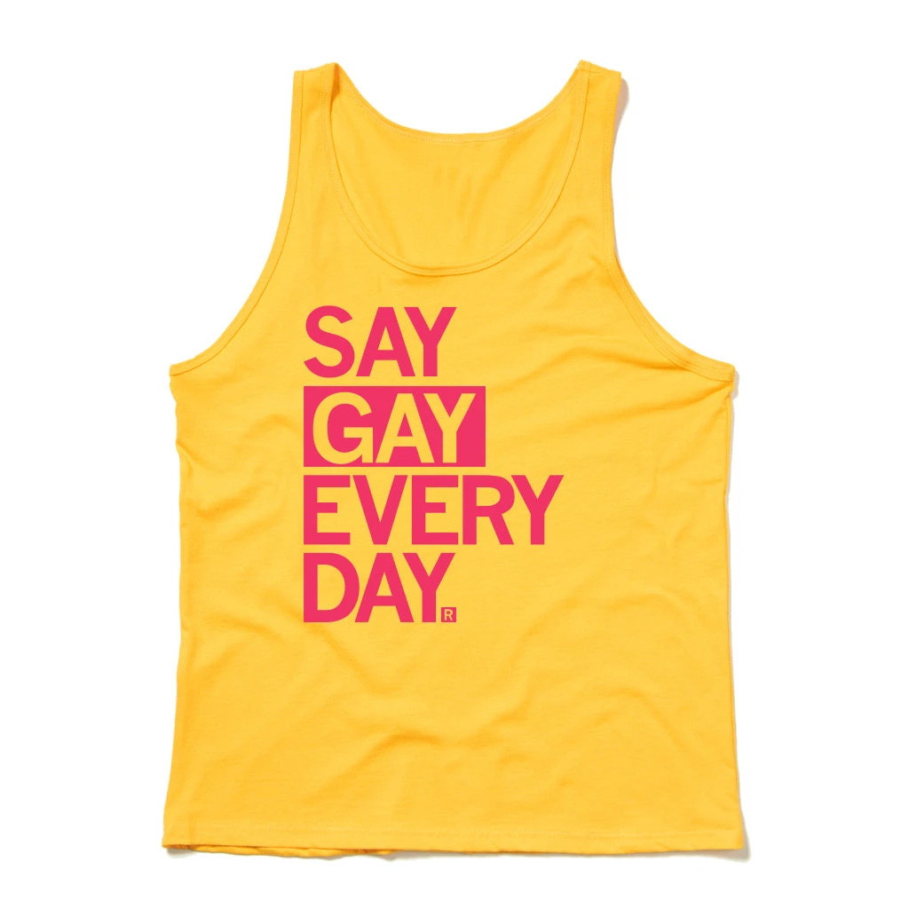 Say Gay Every Day. A Portion of Sales Raise Money For Glaad, the National Center For Transgender Equality, and our local partners Iowa Safe Schools & One Iowa. Aura Pink Screen Print on a Gold Tank Top (100% Combed Ringspun Cotton). Cut and sewn sweatshop free. Designed and printed by Union Labor at RAYGUN.