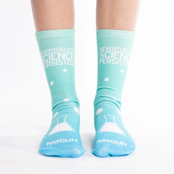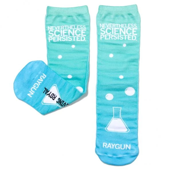 Nevertheless, Science Persisted. One size fits most. (100% polyester) Women’s shoe size 4-12 and Men’s shoe size 6-13. Each sock is handmade; due to the human condition, imperfections may occur. Manufactured by Living Royal in Chicago, IL and designed by RAYGUN.