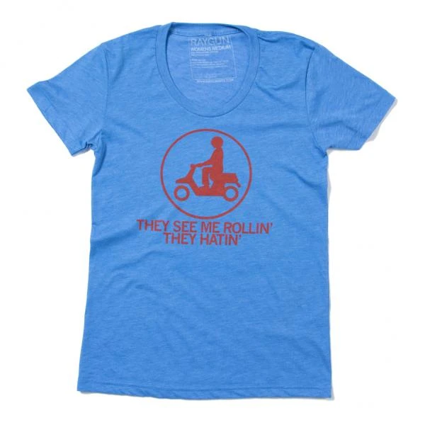 They See Me Rollin’ They Hatin’. This Design Has Been Retired and is No Longer Available on Our Sales Floors But Can Be Ordered Here Online! Since All of Our Retired Designs Are Printed on Demand, Please Allow For a Couple Extra Days Before Shipping. A Portion of All Raygun Sales Raise Money For Organizations That We Support. Red Screen Print on an Athletic Blue T-shirt (50% Cotton / 50% Polyester). Cut and sewn sweatshop free. Designed and printed by Union Labor at RAYGUN