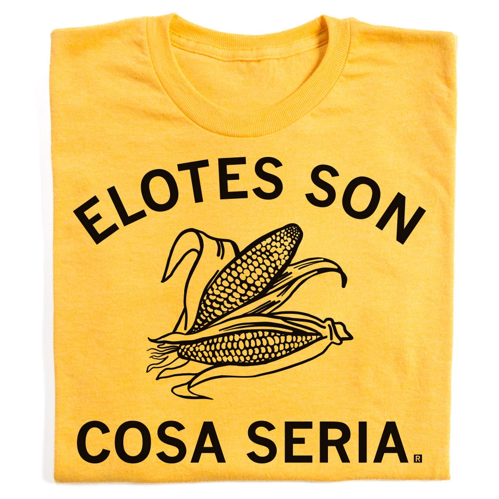 Elotes Son Cosa Seria. A Portion of All RAYGUN Sales Raise Money For Organizations That We Support. Black Screen Print on a Heather Mellow Yellow T-shirt (50% Combed Ringspun Cotton / 50% Polyester). Cut & sewn sweatshop free. Designed and Printed by Union Labor at RAYGUN.