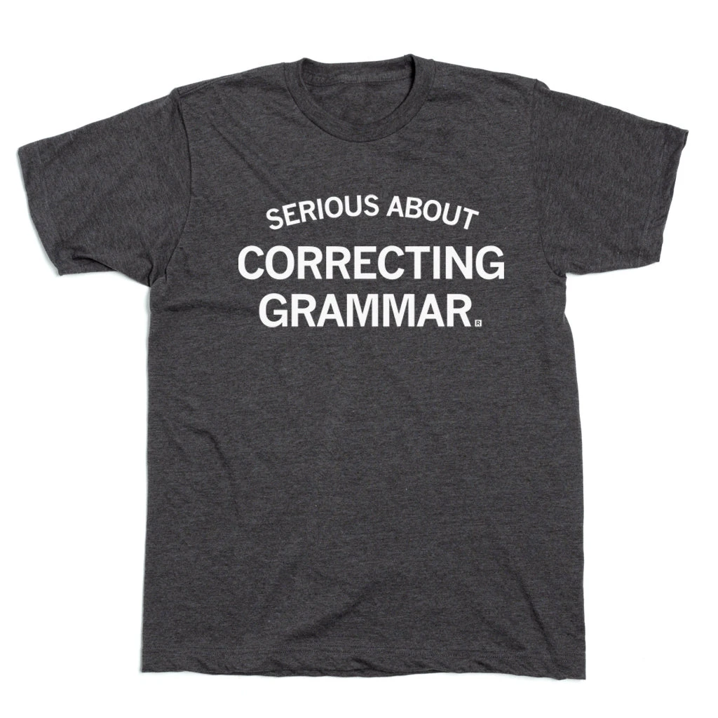 Serious about correcting grammar. And I also do parties! A Portion of All RAYGUN Sales Raise Money For Organizations That We Support. White Screen Print on a Charcoal T-shirt (50% Combed Ringspun Cotton / 50% Polyester). Cut & sewn sweatshop free. Designed and Printed by Union Labor at RAYGUN.