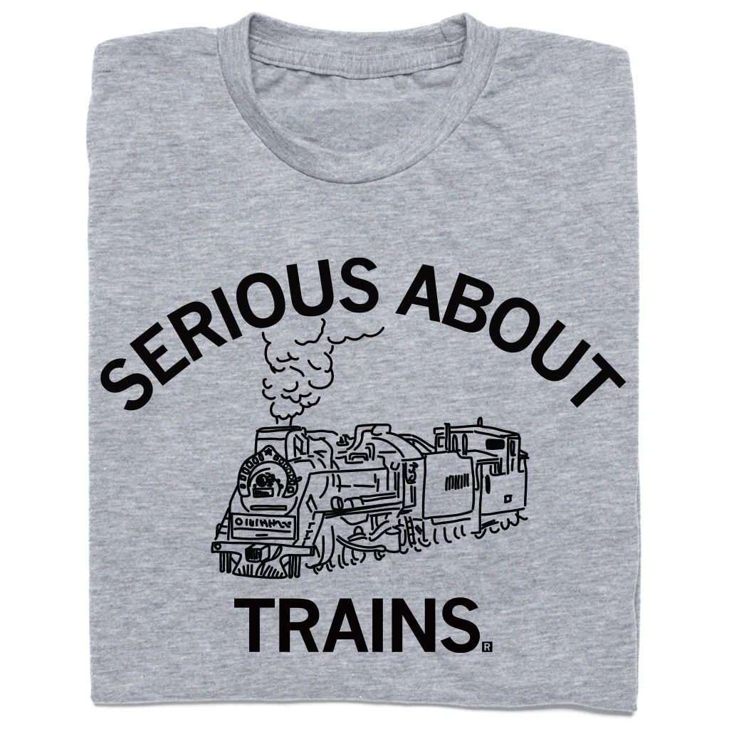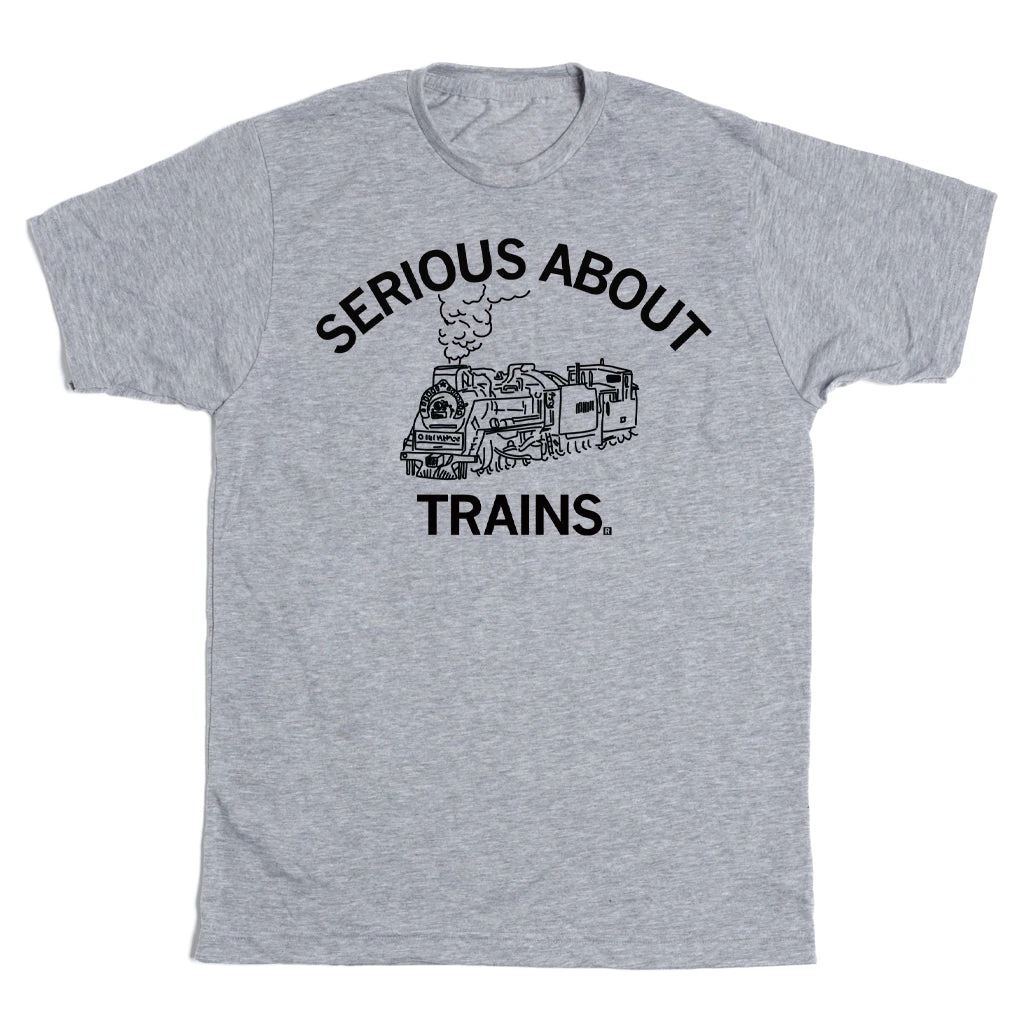 Serious About Trains. A Portion of All RAYGUN Sales Raise Money For Organizations That We Support. Black Screen Print on a Heather Grey T-shirt (65% Polyester / 35% Combed Ringspun Cotton). Cut & sewn sweatshop free. Designed and Printed by Union Labor at RAYGUN.