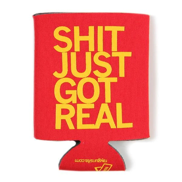 Shit Just Got Real! Gold plastisol ink print on red fade-resistant polyester covered scuba foam. Designed by RAYGUN. Imported and printed in the USA.