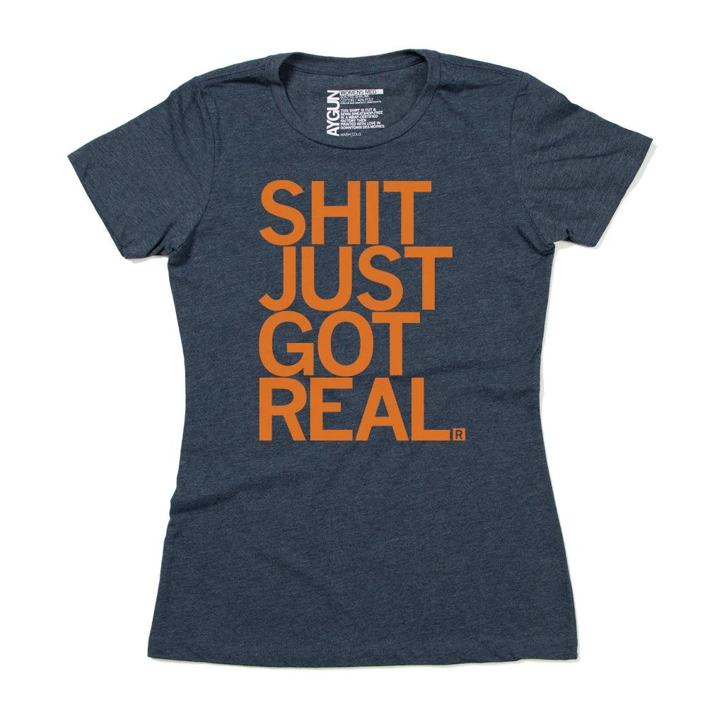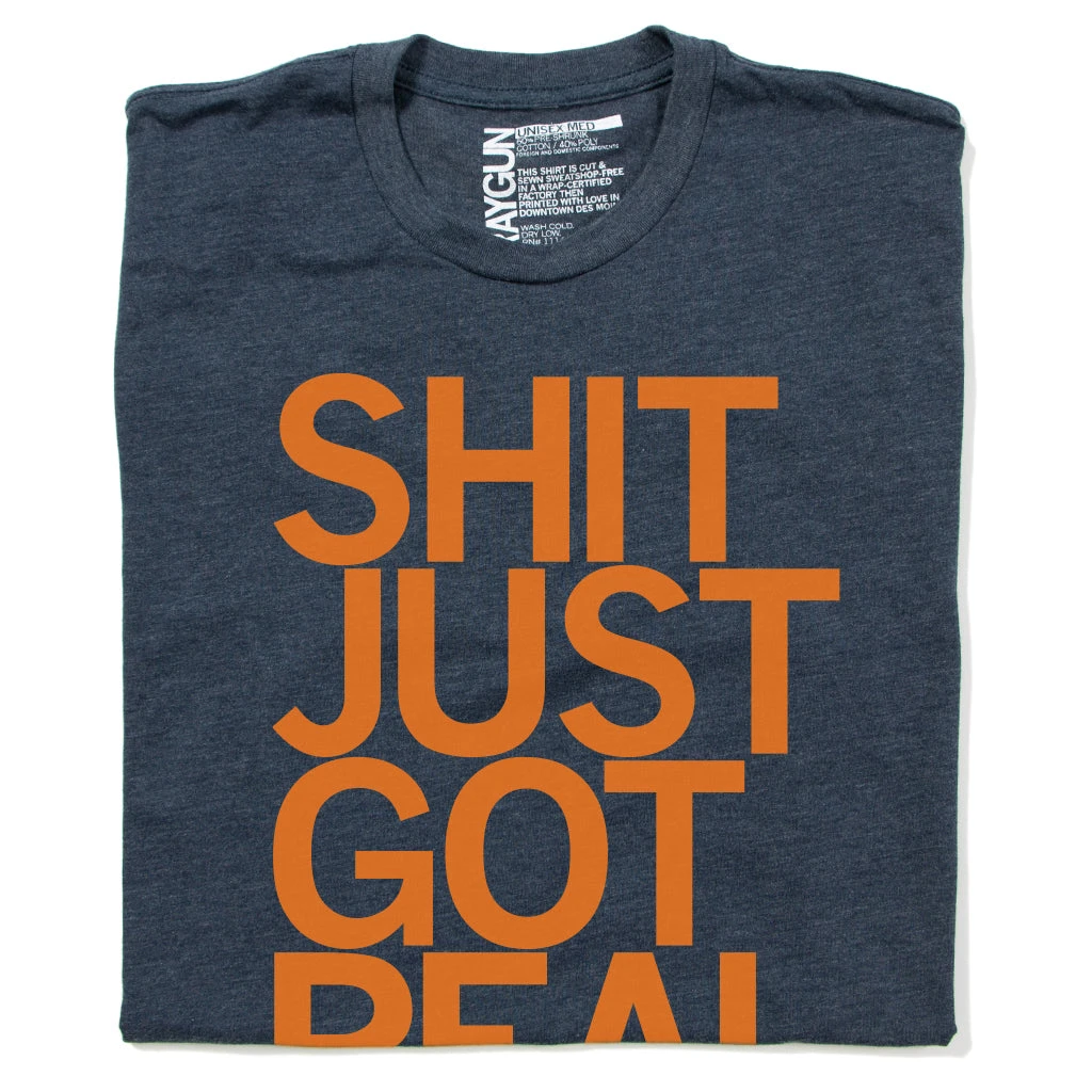 Shit Just Got Real! A Portion of All Raygun Sales Raise Money For Organizations That We Support. Orange Screen Print on a Navy T-shirt (100% Combed Ringspun Cotton). Cut and sewn sweatshop free. Designed and printed by Union Labor at RAYGUN.