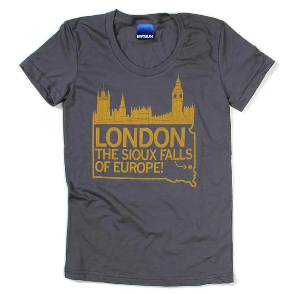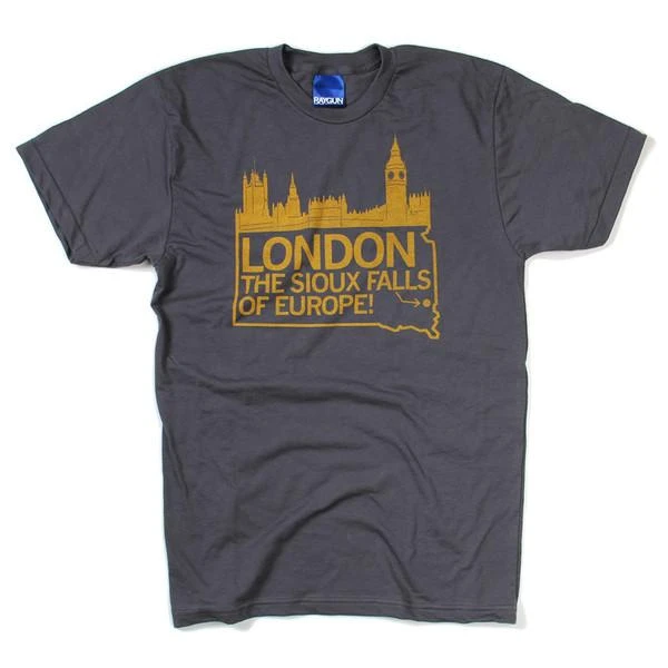 London: The Sioux Falls of Europe. This Design Has Been Retired and is No Longer Available on Our Sales Floors But Can Be Ordered Here Online! Since All of Our Retired Designs Are Printed on Demand, Please Allow For a Couple Extra Days Before Shipping. A Portion of All Raygun Sales Raise Money For Organizations That We Support. Gold Screen Print on a Heavy Metal T-shirt (100% Combed Ringspun Cotton) Cut & sewn sweatshop free. Designed and Printed by Union Labor at RAYGUN