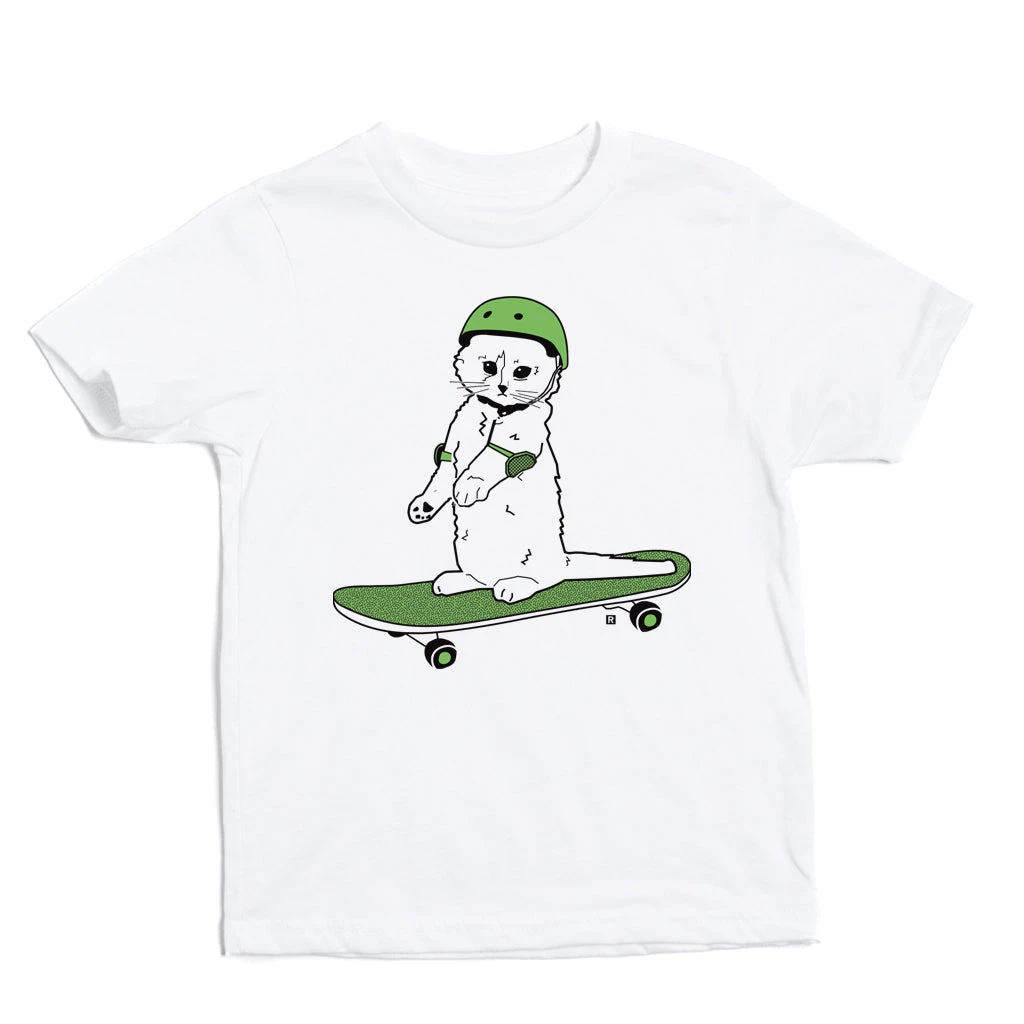 Who says cats can’t skate? 2T & 4T sizes are a Traffic Green Screen Print on a White T-shirt (100% Combed Ringspun Cotton) while 5T (YXS) and above are on a White T-shirt (60% Combed Ringspun Cotton / 40% Polyester) Cut and sewn sweatshop free. Designed and printed by Union Labor at RAYGUN.