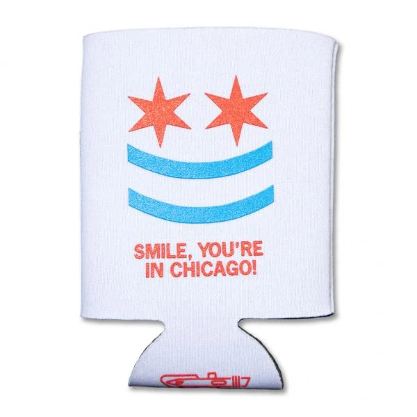 Smile, You’re In Chicago. Red and Blue plastisol ink print on white fade-resistant polyester covered scuba foam. Designed by RAYGUN. Imported and printed in the USA.