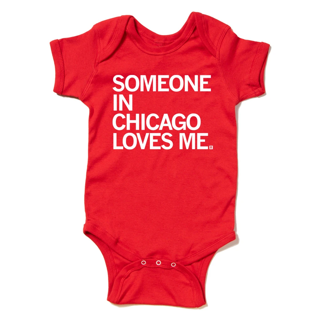 Someone In Chicago Loves Me. White Screen Print on a Red Onesie (100% Baby Rib Cotton). Item will shrink an average of one size when put in the dryer. Cut and sewn sweatshop free. Designed and printed by Union Labor at RAYGUN.