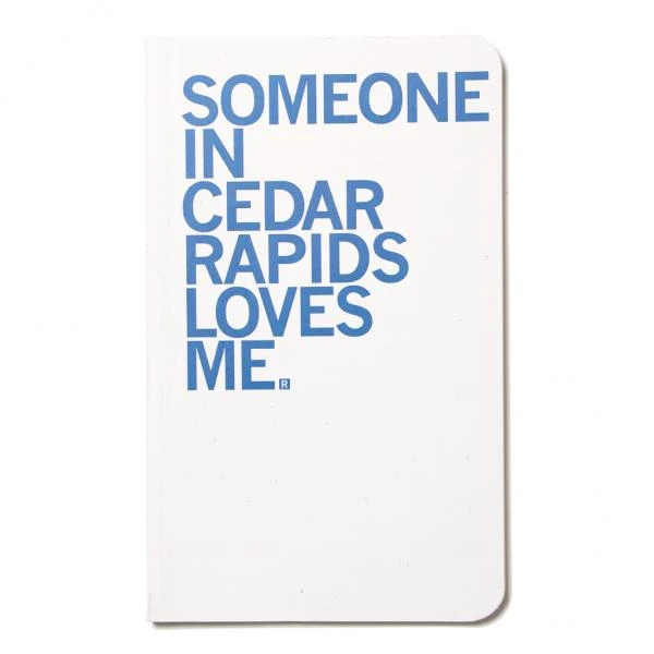 Someone In Cedar Rapids Loves Me. Blue screen print on unlined paper made in the USA. Dimensions: 5.5″ x 8.5.” Designed by RAYGUN and printed by Union Labor at RAYGUN. Assembled using union labor at Garner Printing in Des Moines, IA.