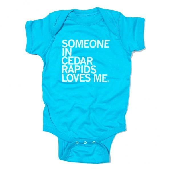 Someone In Cedar Rapids Loves Me. White screen print on turquoise onesie (100% Baby Rib Cotton). Item will shrink an average of one size when put in the dryer. Cut and sewn sweatshop free. Designed and printed by Union Labor at RAYGUN.