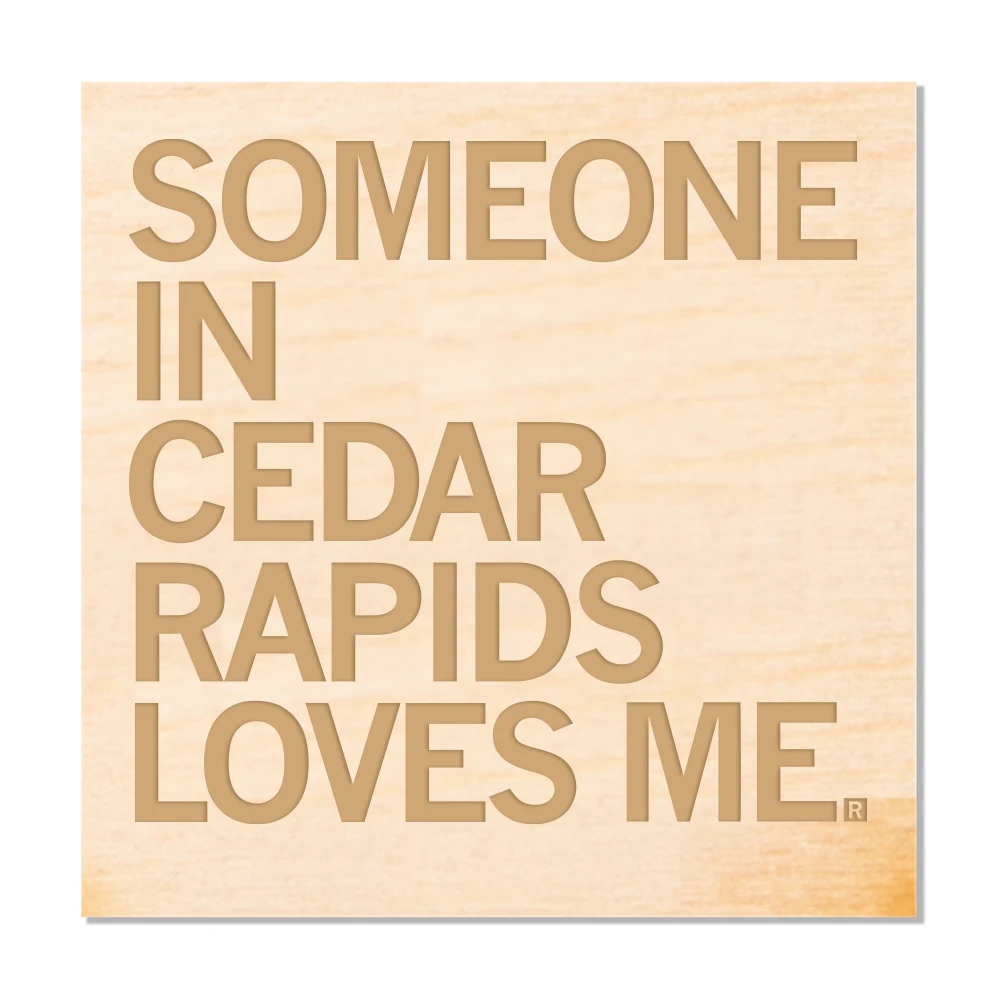 Someone In Cedar Rapids Loves Me. Laser Etch on 1/8 inch Baltic Birch wood. 4×4″ clear sealed and back stained black. Designed by RAYGUN and printed by Union Labor at RAYGUN.