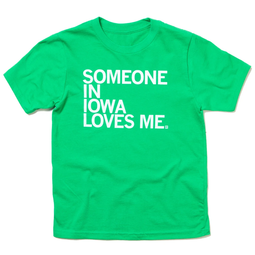 Someone In Iowa Loves Me. 2T & 4T sizes are a White Screen Print on a Kelly Green T-shirt (100% Combed Ringspun Cotton) while 5T (YXS) and above are on a Heather Kelly Green T-shirt (60% Combed Ringspun Cotton / 40% Polyester). Cut and sewn sweatshop free. Designed and printed by Union Labor at RAYGUN.