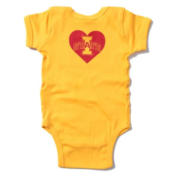 Someone At Iowa State Loves Me. Cardinal screen print on gold Onesie (100% Baby Rib Cotton). Item will shrink an average of one size when put in the dryer. Cut and sewn sweatshop free. Designed and printed by Union Labor at RAYGUN.