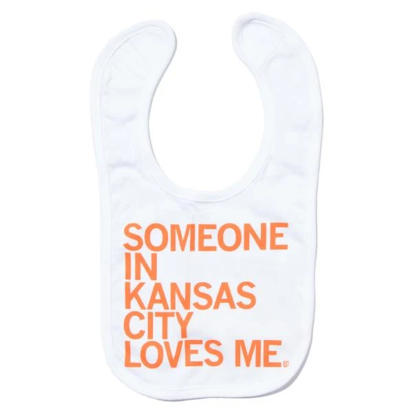 Someone In Kansas City Loves Me. Orange Screen Print on a White Bib (100% Cotton). Cut and sewn sweatshop free. Designed and printed by Union Labor at RAYGUN.