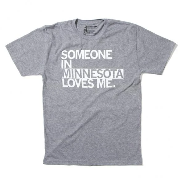 Someone In Minnesota Loves Me. This Design Has Been Retired and is No Longer Available on Our Sales Floors But Can Be Ordered Here Online! Since All of Our Retired Designs Are Printed on Demand, Please Allow For a Couple Extra Days Before Shipping. A Portion of All Raygun Sales Raise Money For Organizations That We Support. White Screen Print on Heather Grey T-shirt (65% Polyester / 35% Combed Ringspun Cotton). Cut and sewn sweatshop free. Designed and printed by Union Labor at RAYGUN.