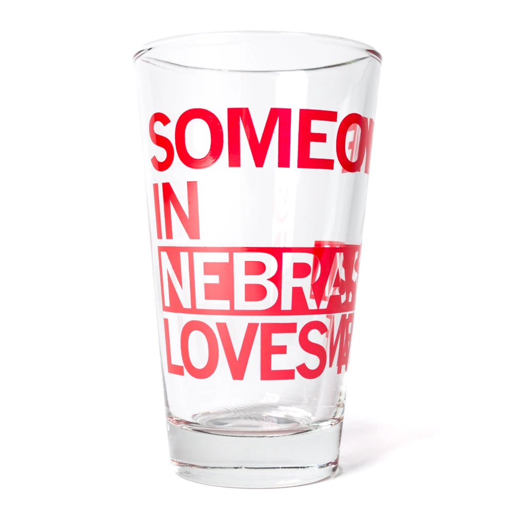 Someone In Nebraska Loves Me. Red soy-based ink print on 16 oz. pint glass. Lead free, fade resistant and dishwasher safe. Designed by RAYGUN and Printed by PyroGraphics in Des Moines, IA.
