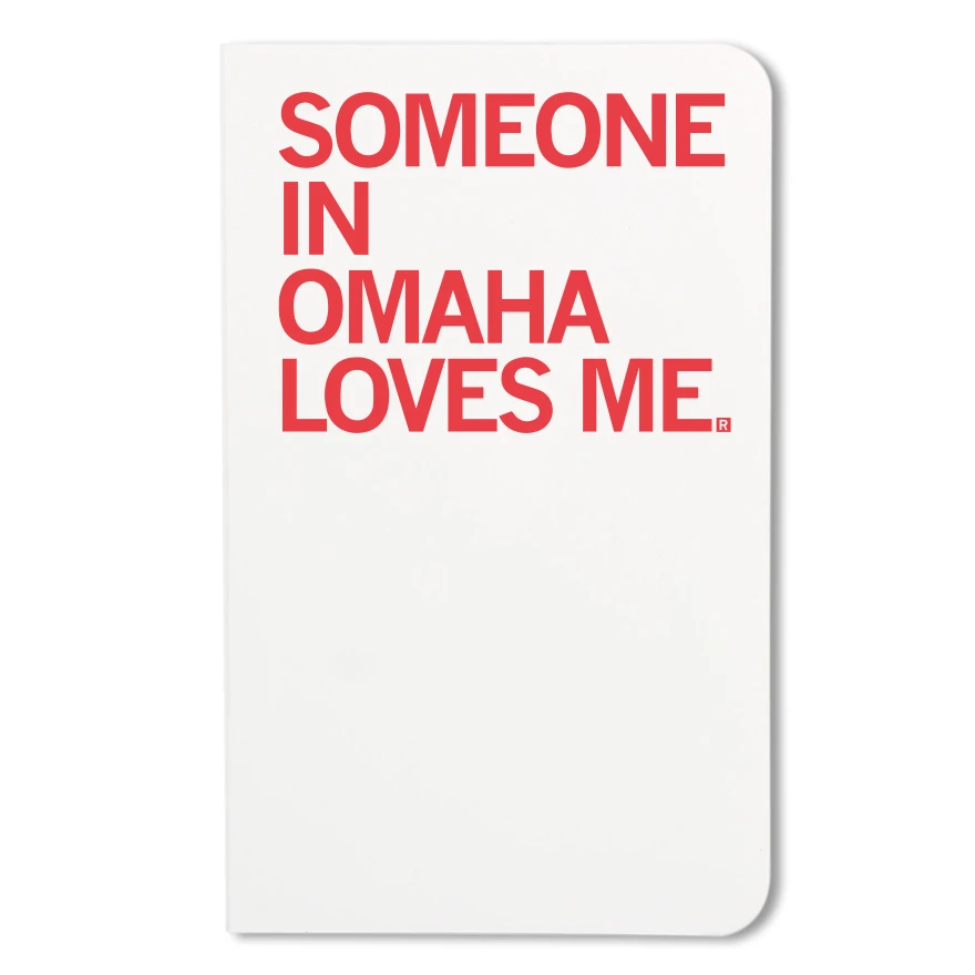 Someone in Omaha Loves Me. Red Screen Print on Unlined paper made in the USA, and dimensions 5.5″ x 8.5″. Designed by RAYGUN and printed by Union Labor at RAYGUN. Assembled using union labor at Garner Printing in Des Moines, IA.