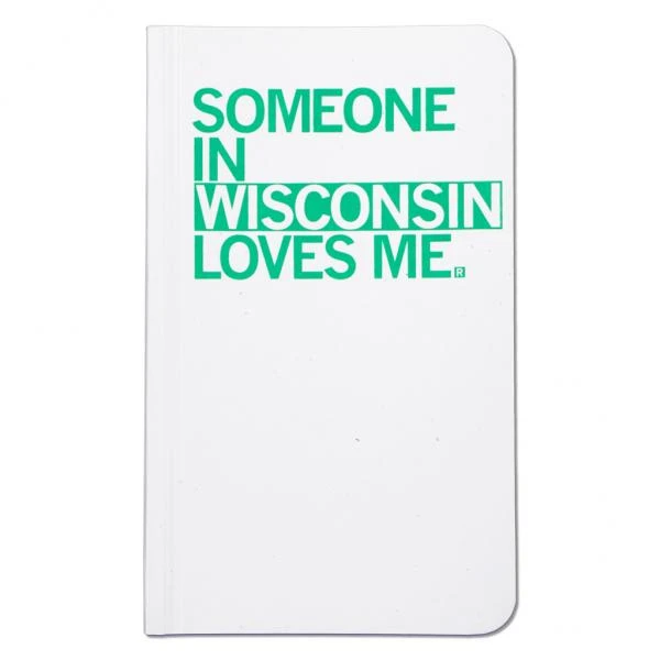Someone In Wisconsin Loves Me. Green screen print on unlined paper made in the USA and dimensions is 5.5″ x 8.5.” Designed by RAYGUN and printed by Union Labor at RAYGUN. Assembled using union labor at Garner Printing in Des Moines, IA.