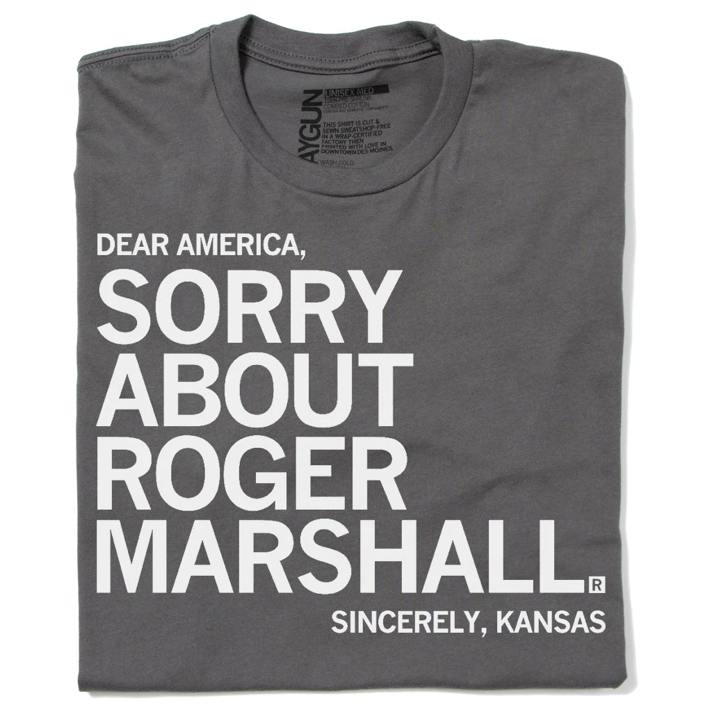 Dear America, Sorry About Roger Marshall. Sincerely, Kansas. A Portion of All Raygun Sales Raise Money For Organizations That We Support. This Design Has Been Retired and is No Longer Available on Our Sales Floors But Can Be Ordered Here Online! Since All of Our Retired Designs Are Printed on Demand, Please Allow For a Couple Extra Days Before Shipping. White Screen Print on a Heavy Metal T-shirt (100% Combed Ringspun Cotton). Cut and sewn sweatshop free. Designed and printed by Union Labor at RAYGUN.