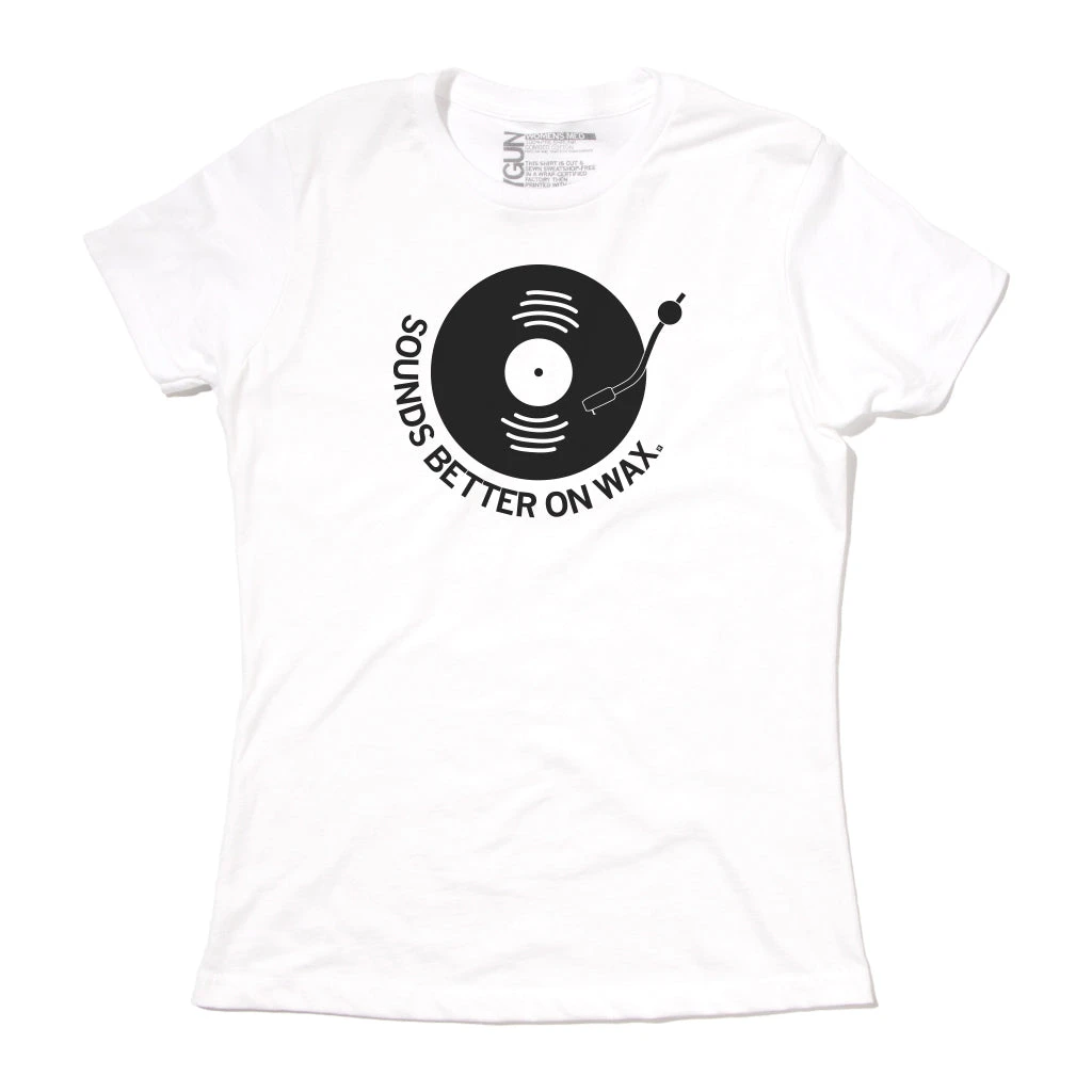Sounds Better On Wax. A Portion of All RAYGUN Sales Raise Money For Organizations That We Support. Black Screen Print on a White T-shirt (100% Combed Ringspun Cotton). Cut and sewn sweatshop free. Designed and printed by Union Labor at RAYGUN.