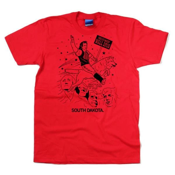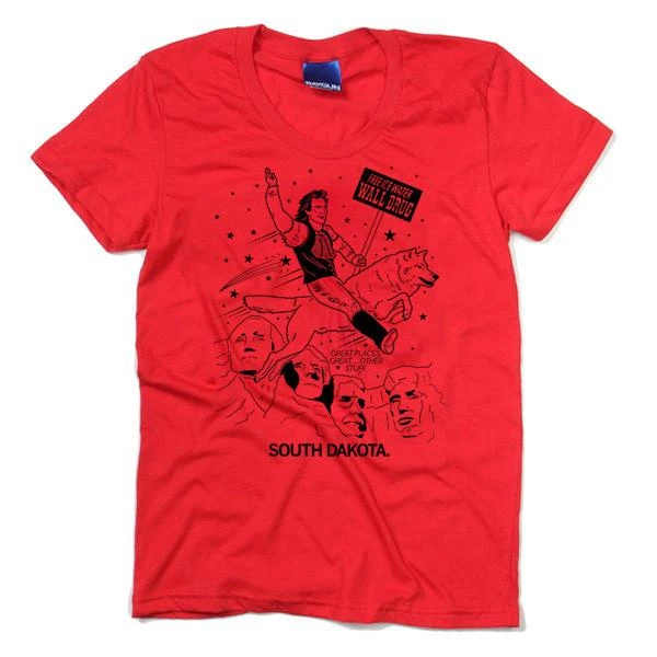 South Dakota Mashup. This Design Has Been Retired and is No Longer Available on Our Sales Floors But Can Be Ordered Here Online! Since All of Our Retired Designs Are Printed on Demand, Please Allow For a Couple Extra Days Before Shipping. A Portion of All Raygun Sales Raise Money For Organizations That We Support. Black Screen Print on a Red T-shirt (100% Combed Ringspun Cotton) Cut & sewn sweatshop free. Designed and Printed by Union Labor at RAYGUN