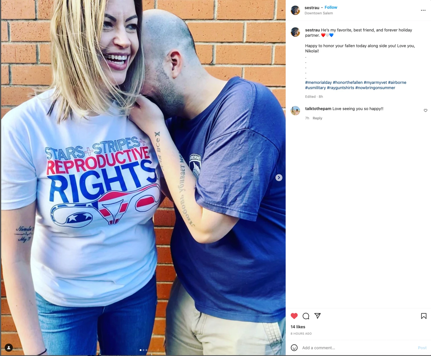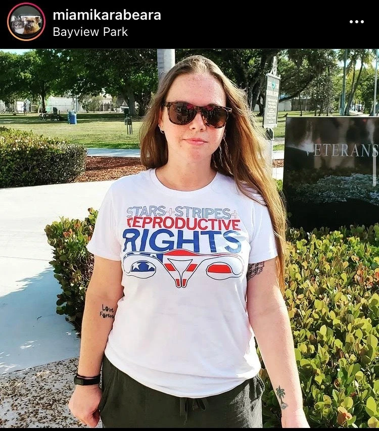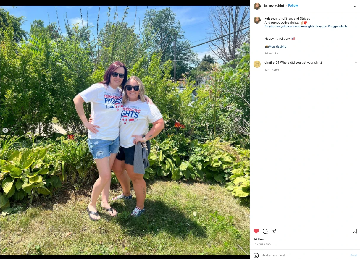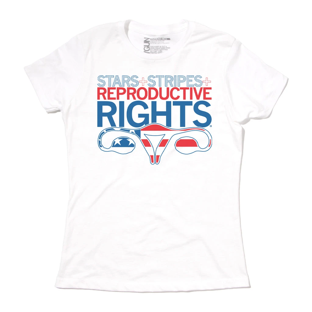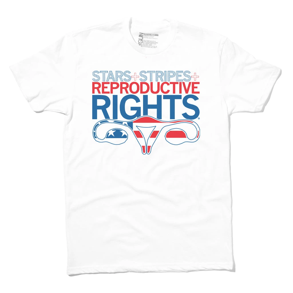 Stars, Stripes and Reproductive Rights. Some proceeds from sales go to Planned Parenthood North Central States. Royal Blue and Brite Red Screen Print on a White T-shirt (100% Combed Ringspun Cotton). Cut and sewn sweatshop free. Designed and printed by Union Labor at RAYGUN.