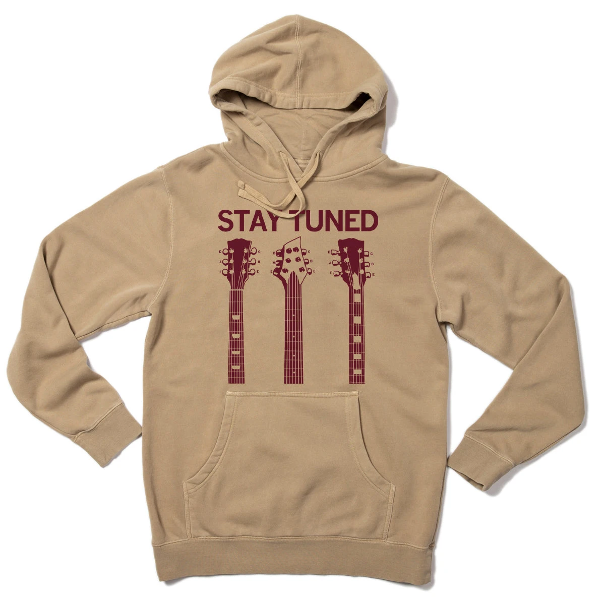 Stay Tuned. A Portion of All RAYGUN Sales Raise Money For Organizations That We Support. Maroon Screen Print on a Pigment Sandstone Pullover Hoodie (80% Combed Ringspun Cotton / 20% Polyester). Cut and sewn sweatshop free. Designed and printed by Union Labor at RAYGUN.