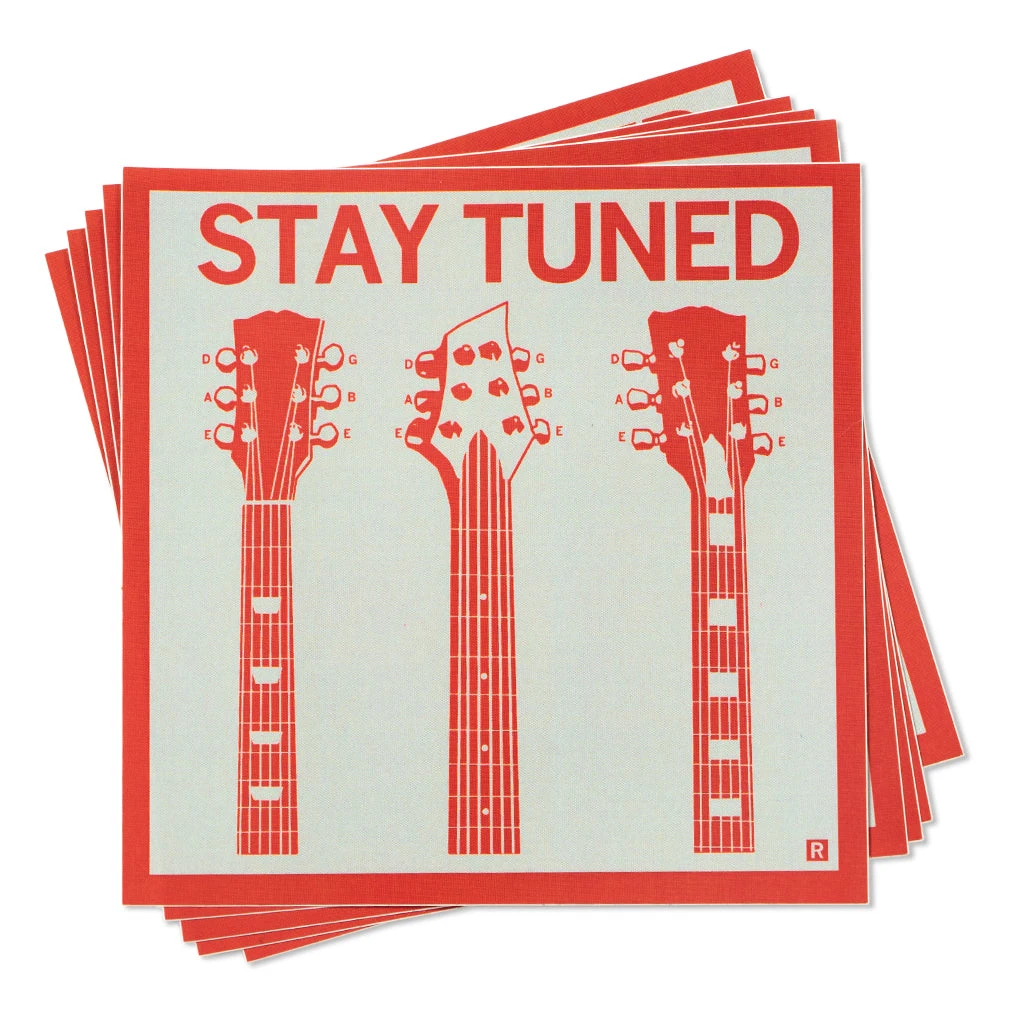 Stay Tuned. 4″ x 4″ Vinyl sticker. Designed by RAYGUN and printed by union labor at Garner Printing in Des Moines, IA.