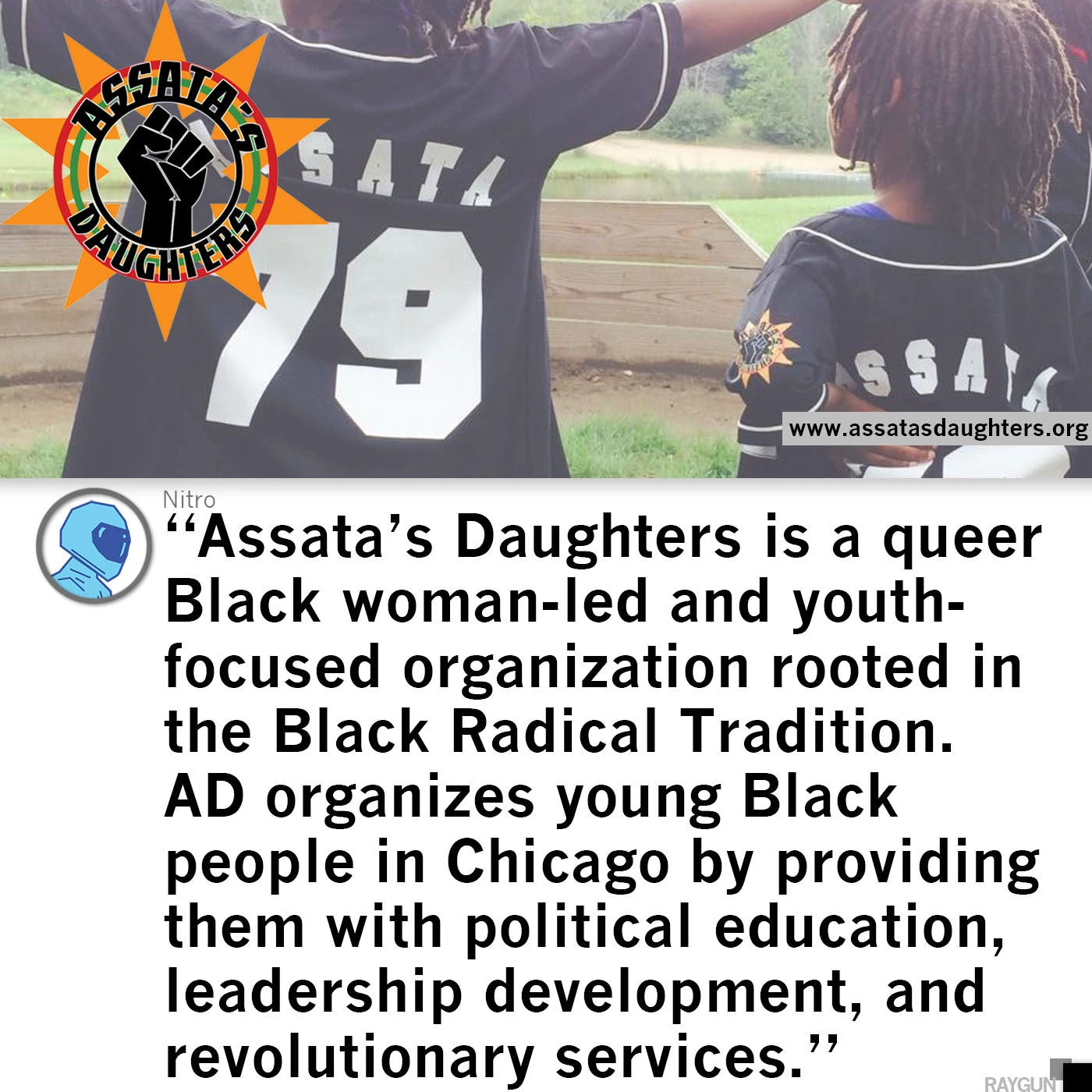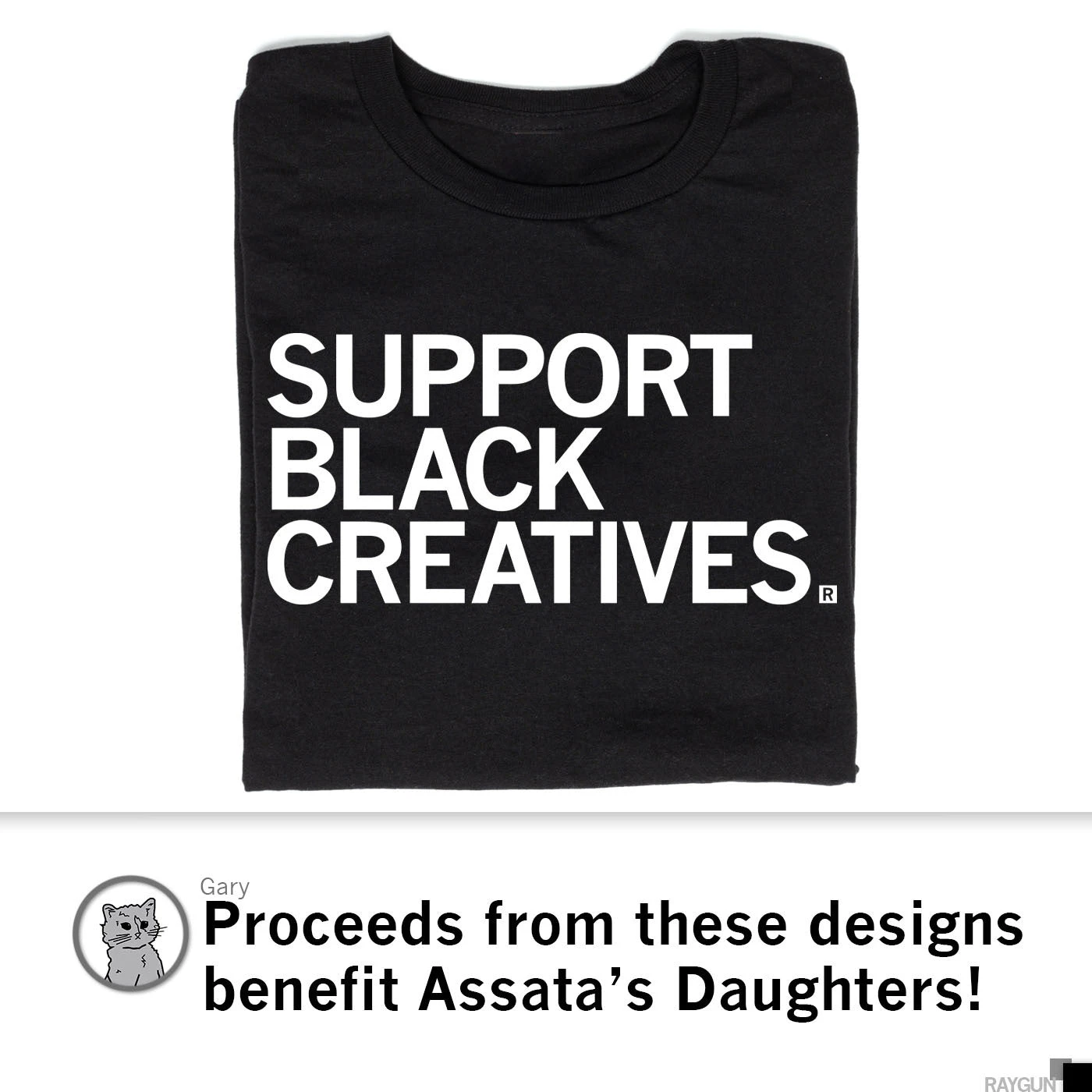 Support Black Creatives. Some proceeds go to Assata’s Daughters. A Portion of All RAYGUN Sales Raise Money For Organizations That We Support. White Screen Print on a Black T-shirt (100% Combed Ringspun Cotton). Cut & sewn sweatshop free. Designed and Printed by Union Labor at RAYGUN.