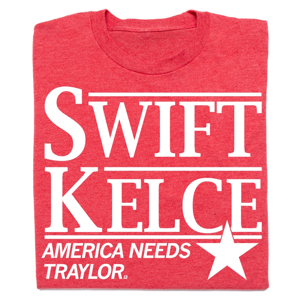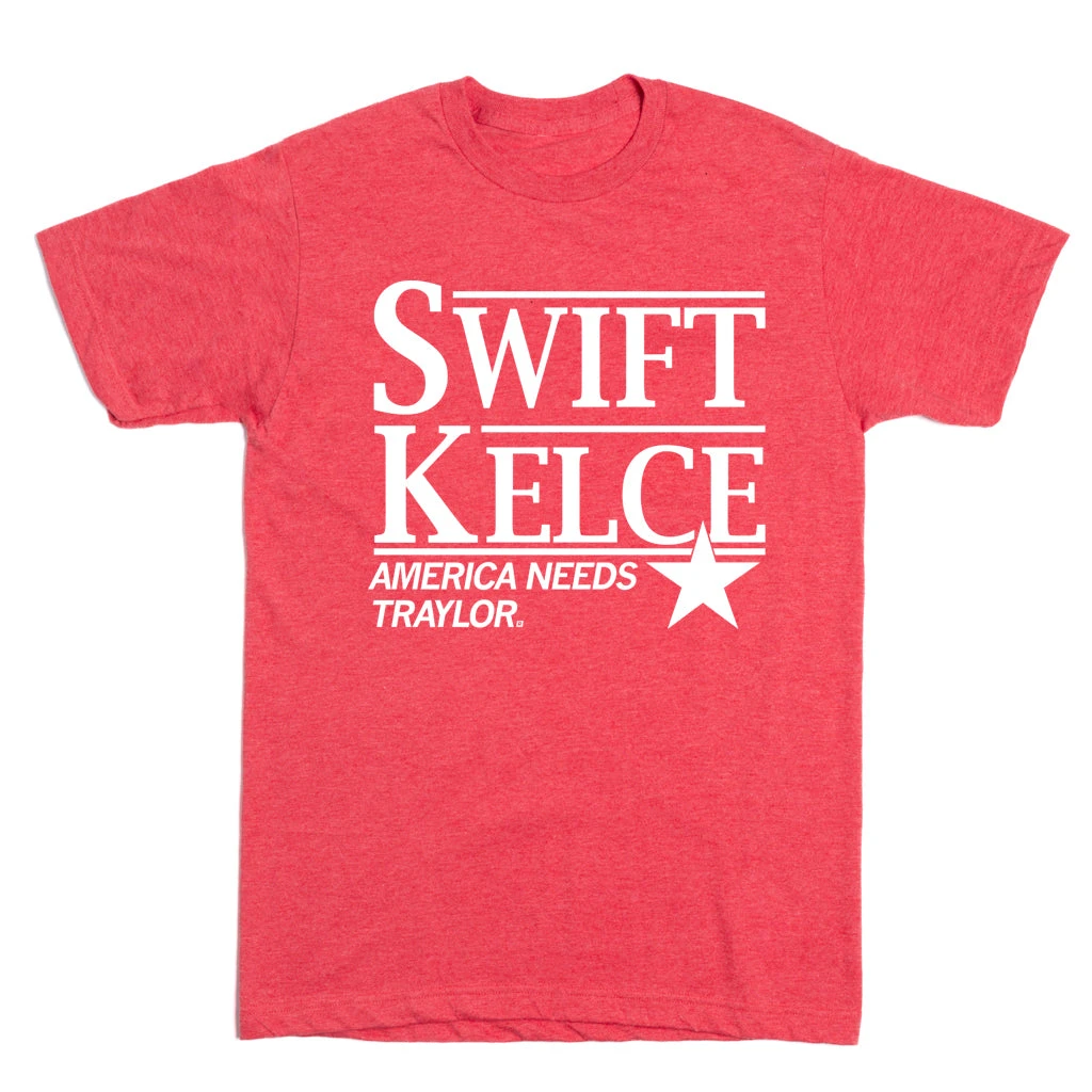 Swift Kelce. America Needs Traylor. A Portion of All RAYGUN Sales Raise Money For Organizations That We Support. White Screen Print on a Heather Red T-shirt (50% Combed Ringspun Cotton / 50% Polyester). Cut and sewn sweatshop free. Designed and printed by Union Labor at RAYGUN.