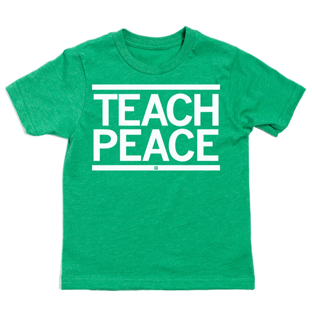 Teach Peace. 2T & 4T sizes are a White Screen Print on a Kelly Green T-shirt (100% Combed Ringspun Cotton) while 5T (YXS) and above are on a Heather Kelly Green T-shirt (60% Combed Ringspun Cotton / 40% Polyester). Cut and sewn sweatshop free. Designed and printed by Union Labor at RAYGUN.